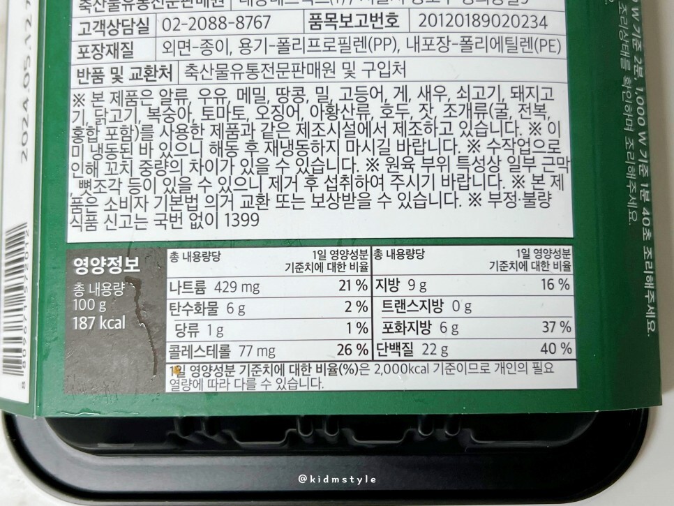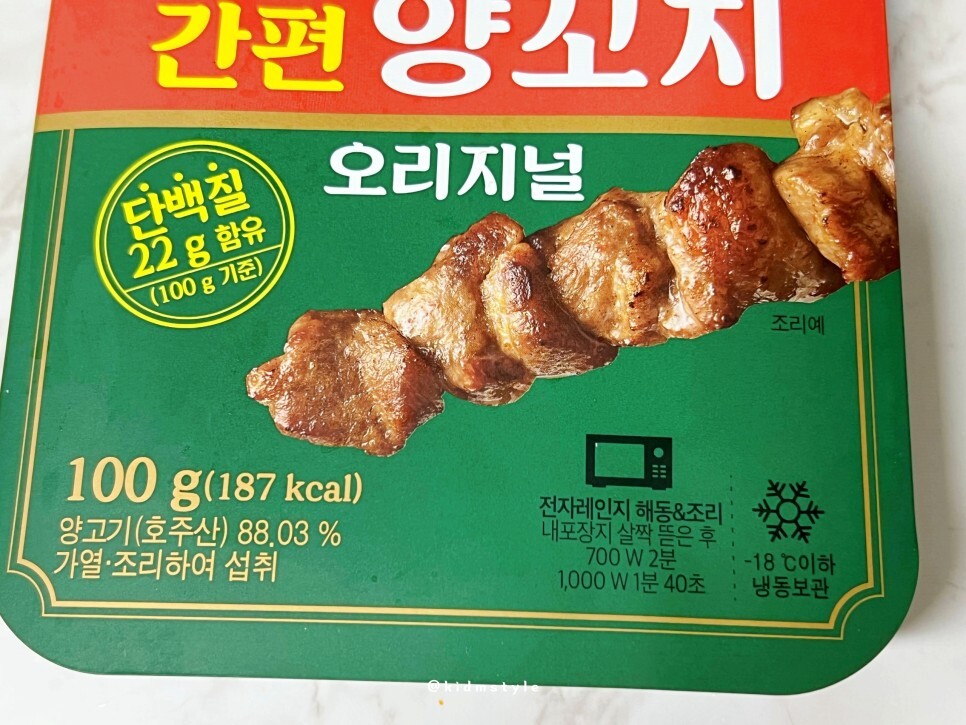 100g에 187kcal이며 호주산 양고기 88%입니다. 냉동 보관해야 하며 전자레인지로 간편하게 해동 조리가 가능합니다. 가정용 700w 기준으로 2분만 돌리면 됩니다.