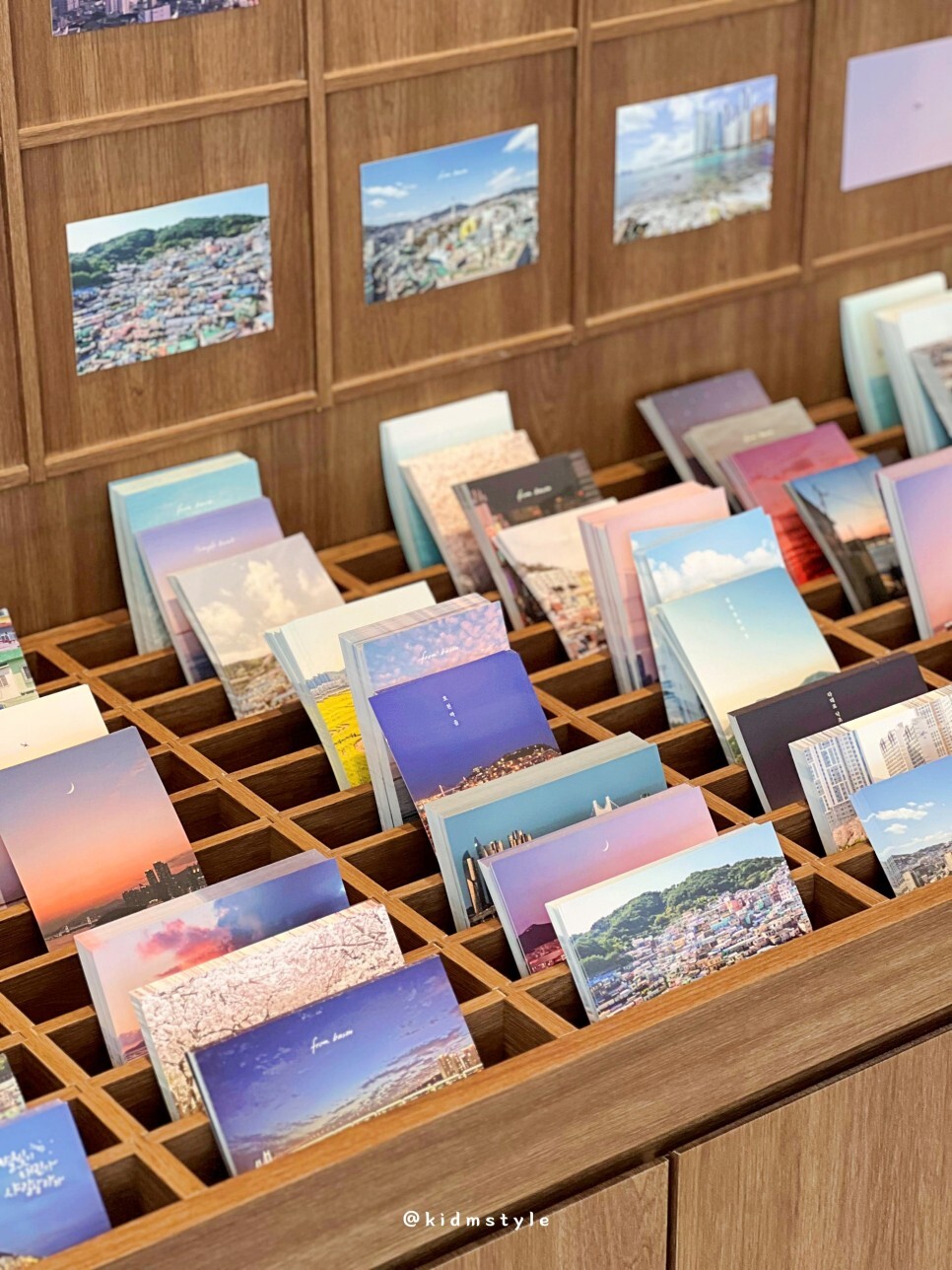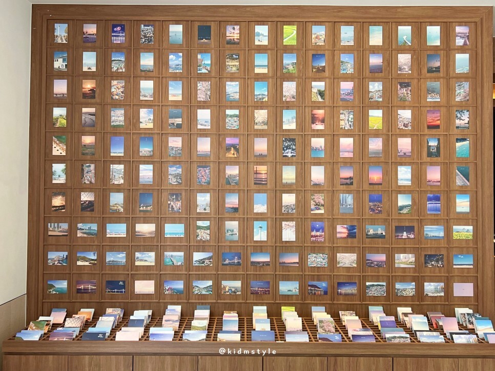한쪽 벽에는 엽서로 가득 차 있는데요. 이 벽이 이 카페의 인기 있는 포인트이기도 하죠. 부산에서 활동하는 스냅 작가들의 작품을 엽서로 만들어 놓았는데요. 제 인스타 사진 계정으로 소통하는 작가분도 있길래 반가웠어요. @kidm_foto 제 인스타 사진 계정이고요. @kidmstyle 부산맛집 계정이에요. 인스타 하시는 분들 놀러 오세요.