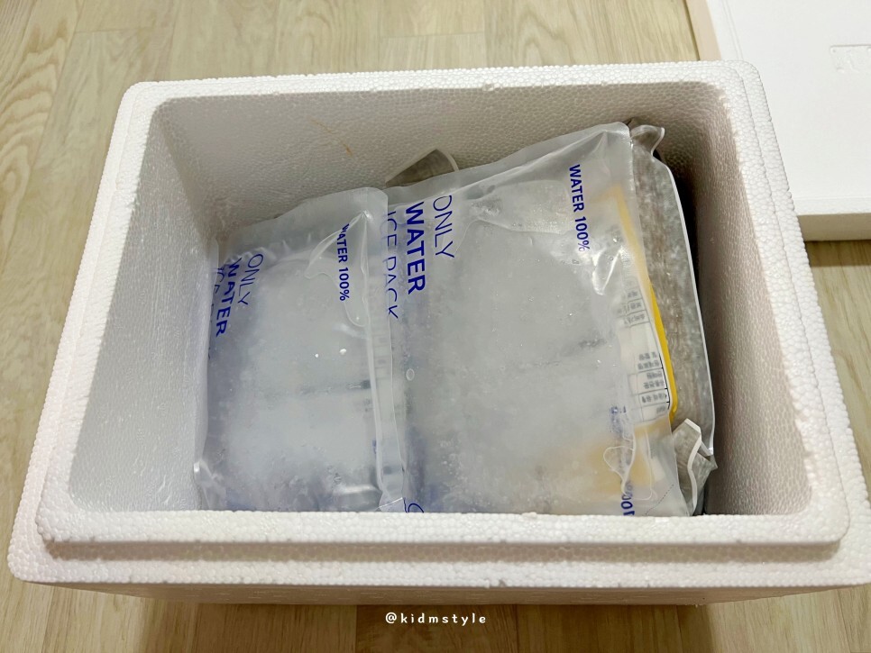 6월의 더운 날씨임에도 불구하고 꽝꽝 얼어서 왔기에 좀 놀랐습니다. 제가 늘 말씀드리지만 보냉재의 냉기가 위에서 아래로 흐르기 때문에 택배 발송 시 보냉재를 제일 상단에 올리면 그 효과가 극대화됩니다.