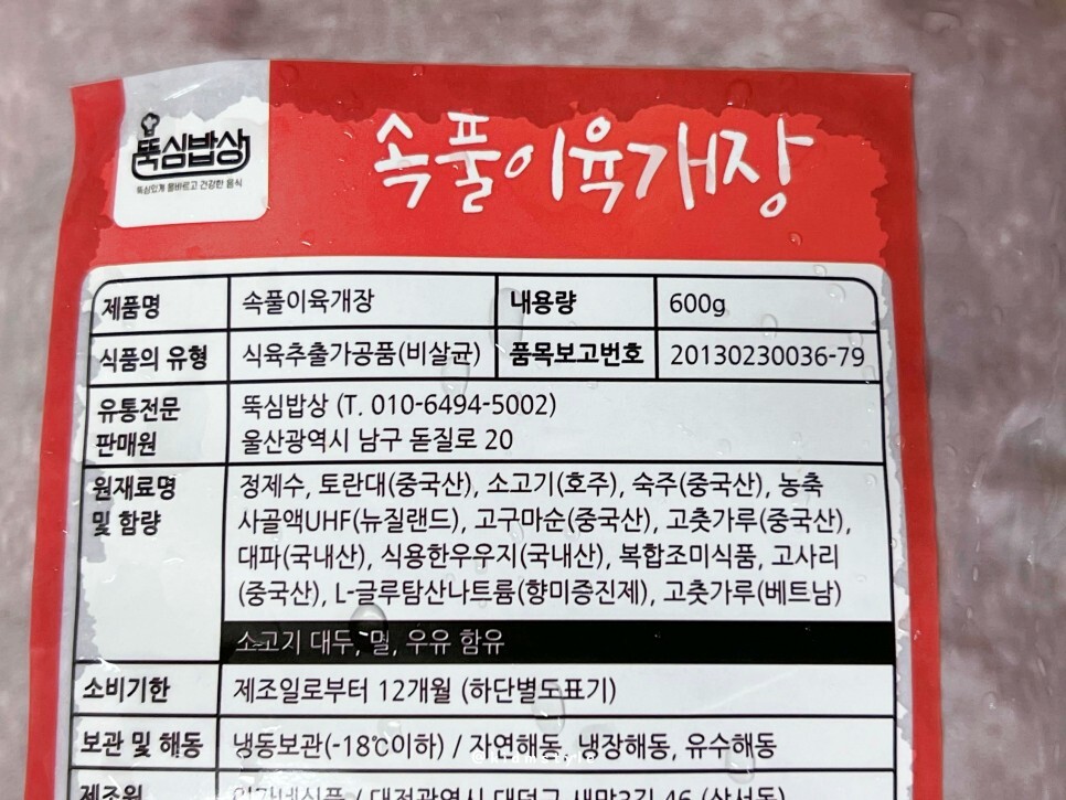 뚝심밥상 속풀이 육개장의 원재료 등 정보입니다. 내용량은 600g이에요. 성인 1인분 혹은 2인분 정도로 맛볼 수 있겠네요.
