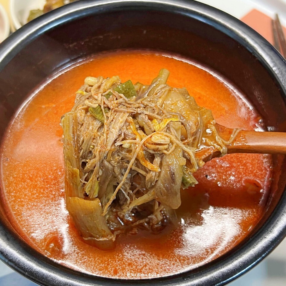 육개장의 대표적인 재료인 토란대, 숙주, 대파 등이 들어가 있는데 질기지 않고 전부 부드럽습니다. 이 부분 마음에 드네요.