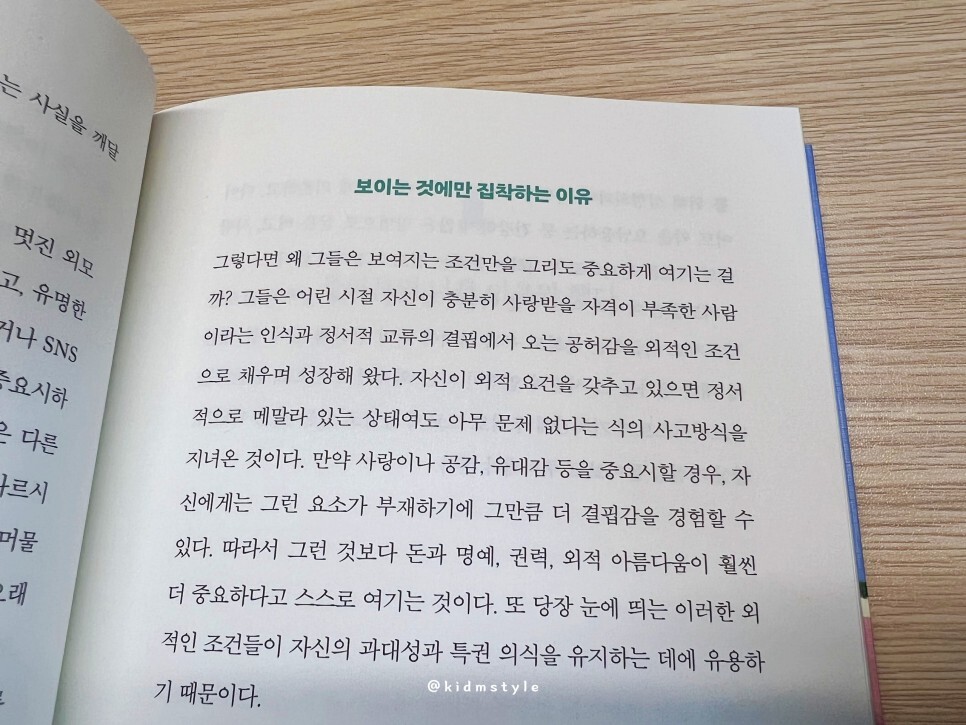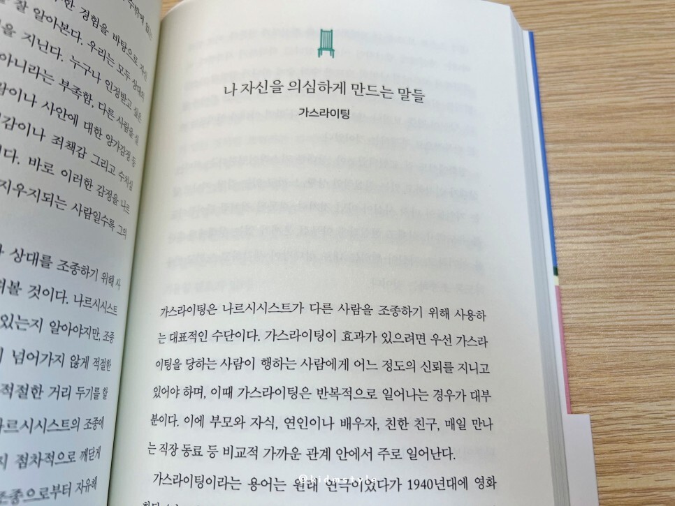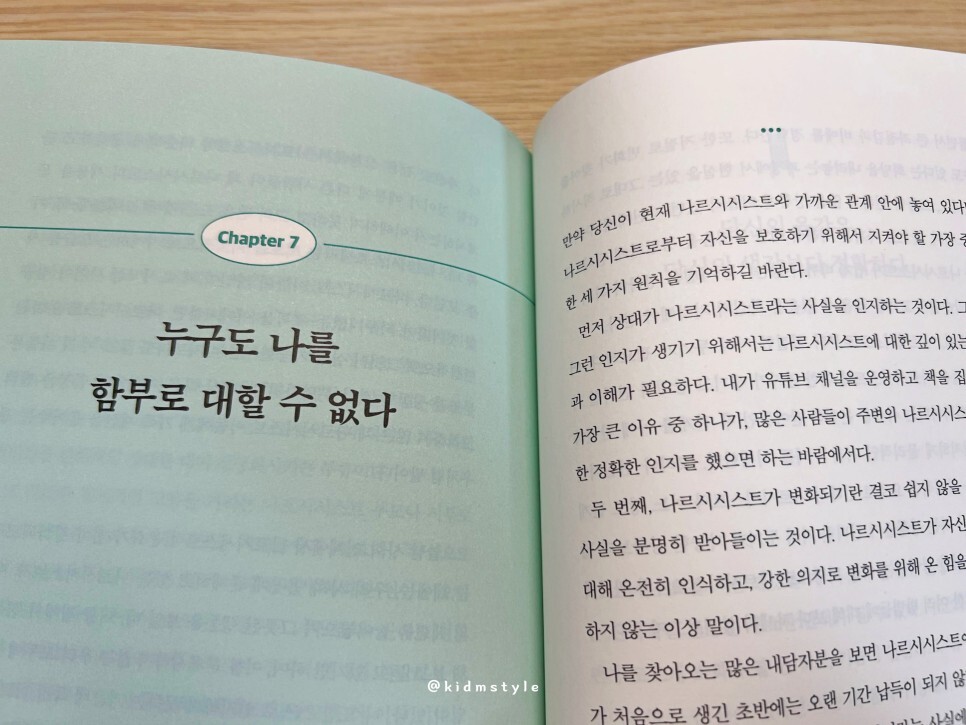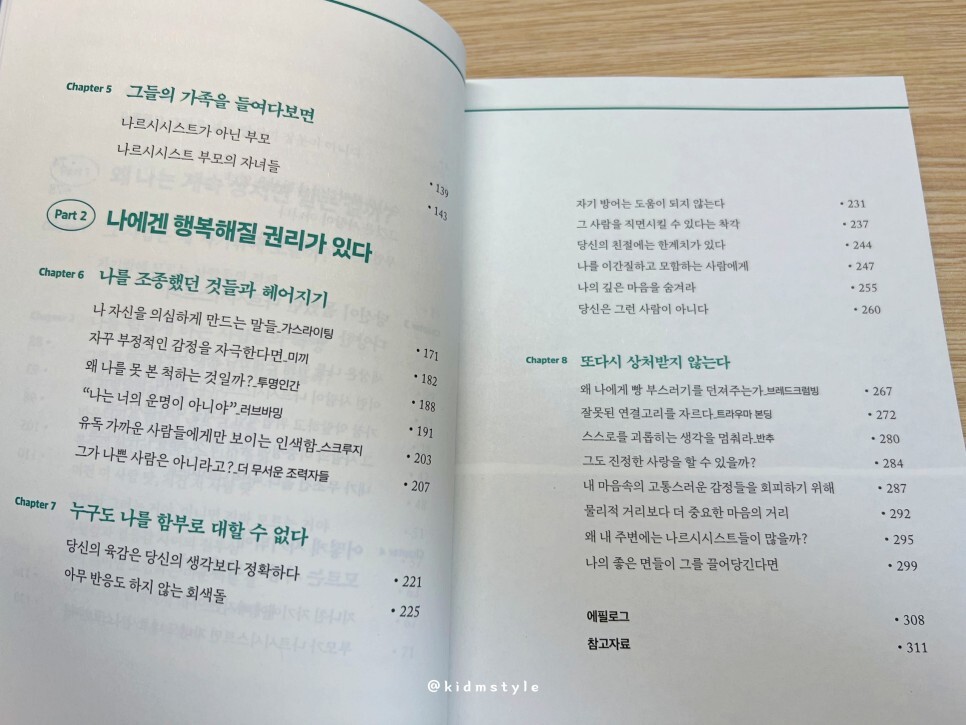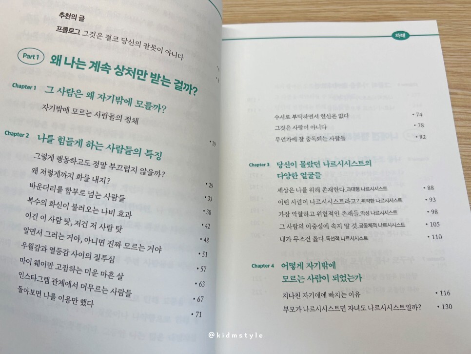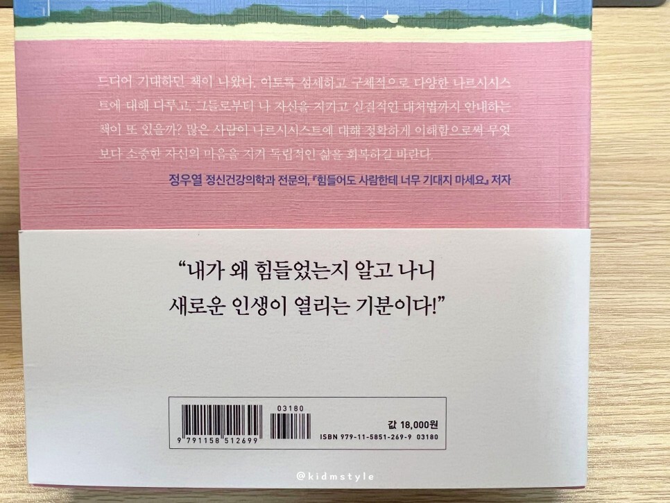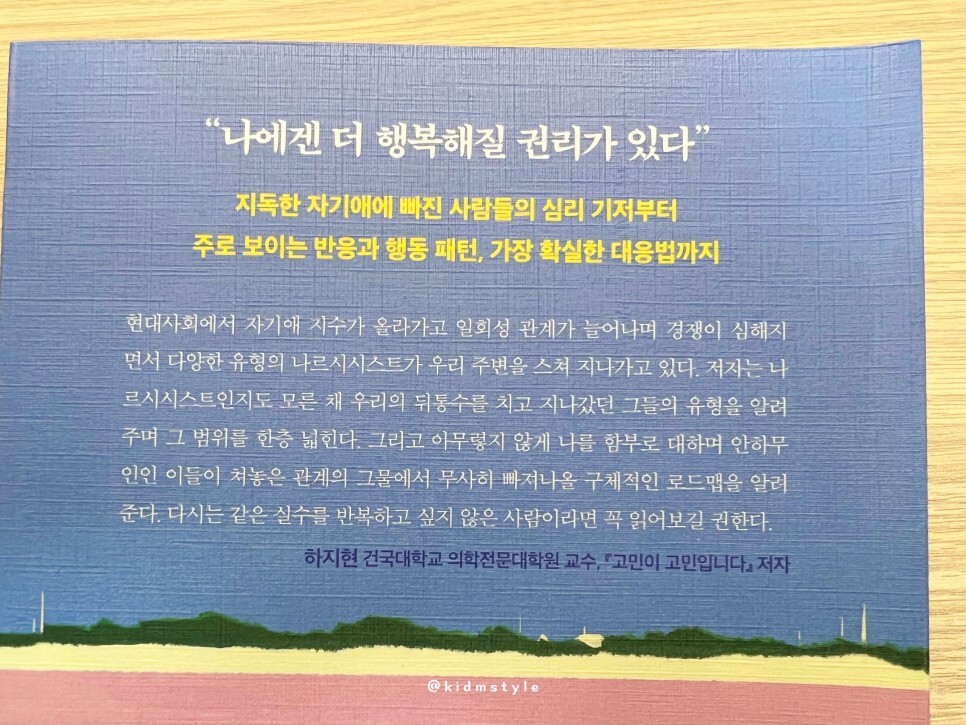 이 책은 우리가 잘 인지하지 못하고 지내왔던 나르시시즘과 나르시시스트의 구체적인 모습을 일상의 사례와 설명을 통해 알려줍니다. 조금이라도 관심이 있다면 한번 읽어보세요.