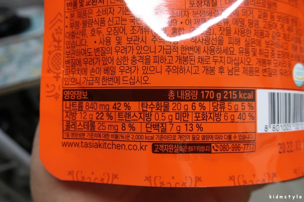 뒷면에는 조리방법, 원재료명, 영양정보 등 필수 정보들이 빠짐없이 적혀있다.