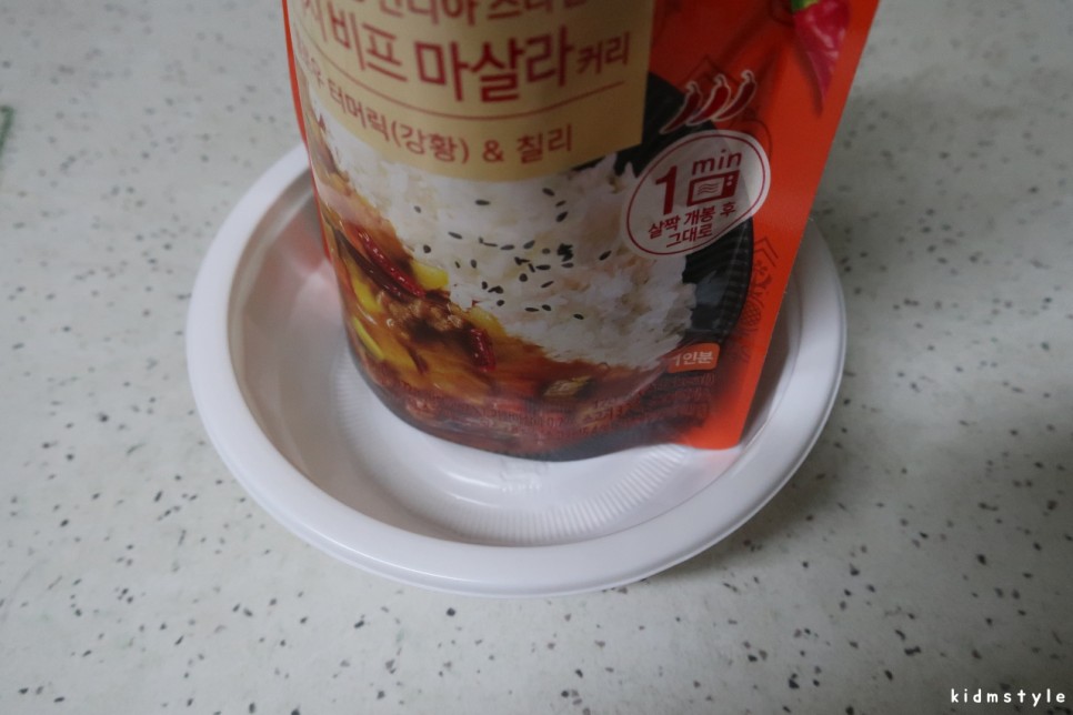 노란 강황과 칠리가 들어가 있고 살짝 개봉 후 전자레인지에 1분간 돌리면 된다. 1분은 1000w 짜리, 700w는 1분 30초이다.