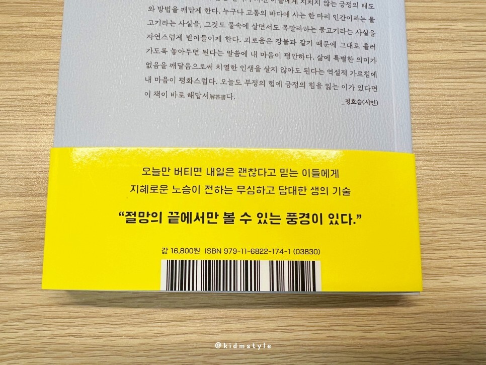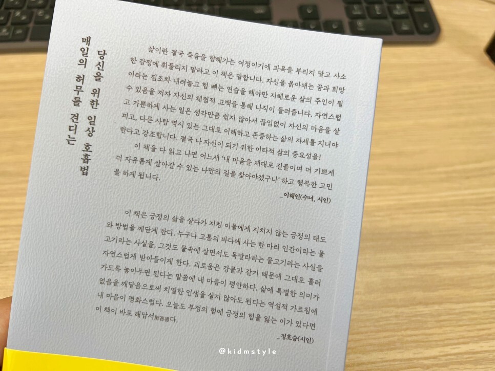 매일의 허무를 견디는 당신을 위한 일상 호흡법, 읽어보니 공감이 되는 부분이었습니다. 인문학 책이라기보다는 에세이적인 느낌이 강한데요. 책에서 작가가 전달하는 메시지가 꽤 철학적이며 와닿는 부분이 많아서 인문학으로 봐도 되겠다 싶더군요.