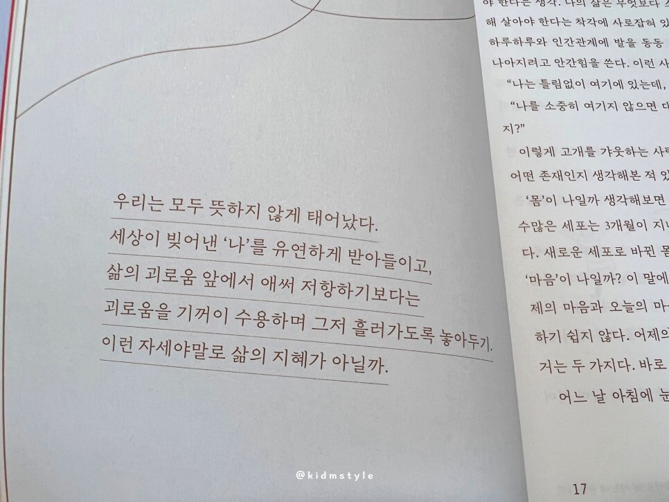 나라는 존재를 유연하게 받아들이고 삶의 괴로움 앞에서 애써 저항하기보다는 괴로움을 기꺼이 수용하며 흘러가도록 놓아두기. 이 말을 보는 순간 아차 싶었습니다. 아마 이 문구를 읽고 와닿는 분들 많으실 거예요. 물 흐르듯 이런 자세가 삶의 지혜가 아닐까 생각해 봅니다.
