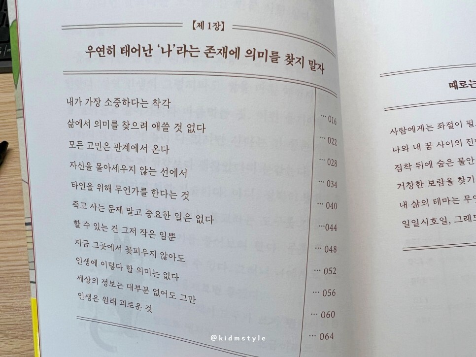 세상 속에서 나 자신을 찾고 나답게 살아가는 것, 결국 삶의 의미를 발견하는 것이 참 중요한 부분이라고 생각합니다. 그리고 꿈을 이루기 위해 끊임없이 노력해야 하는 부분을 목차에서는 역설적으로 적어놓은 것 같습니다.
