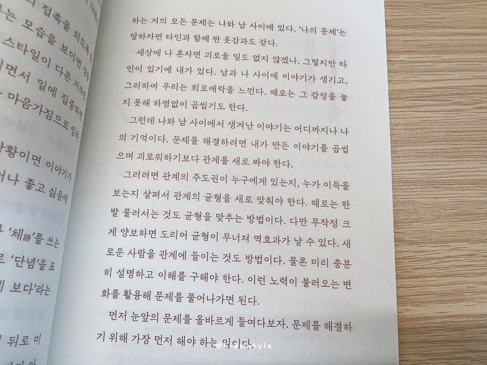 나와 남 사이에서 생겨난 이야기는 어디까지나 나의 기억이다. 문제를 해결하려면 내가 만든 이야기를 곱씹으며 괴로워하기보다 관계를 새로 짜야 한다. 그러려면 관계의 주도권이 누구에게 있는지, 누가 이득을 보는지 살펴서 관계의 균형을 새로 맞춰야 한다. 때로는 한발 물러서는 것도 균형을 맞추는 방법이다.