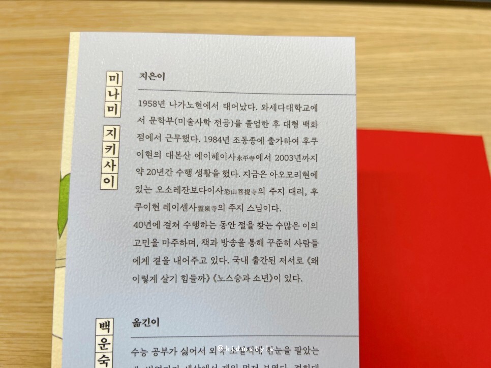 저자 미나미 지키사이는 약 40년간 수행하고 있는 스님입니다. 그동안 절을 찾는 수많은 이의 고민을 마주하며 그 이야기들을 에세이 형식으로 담기도 하는데요.