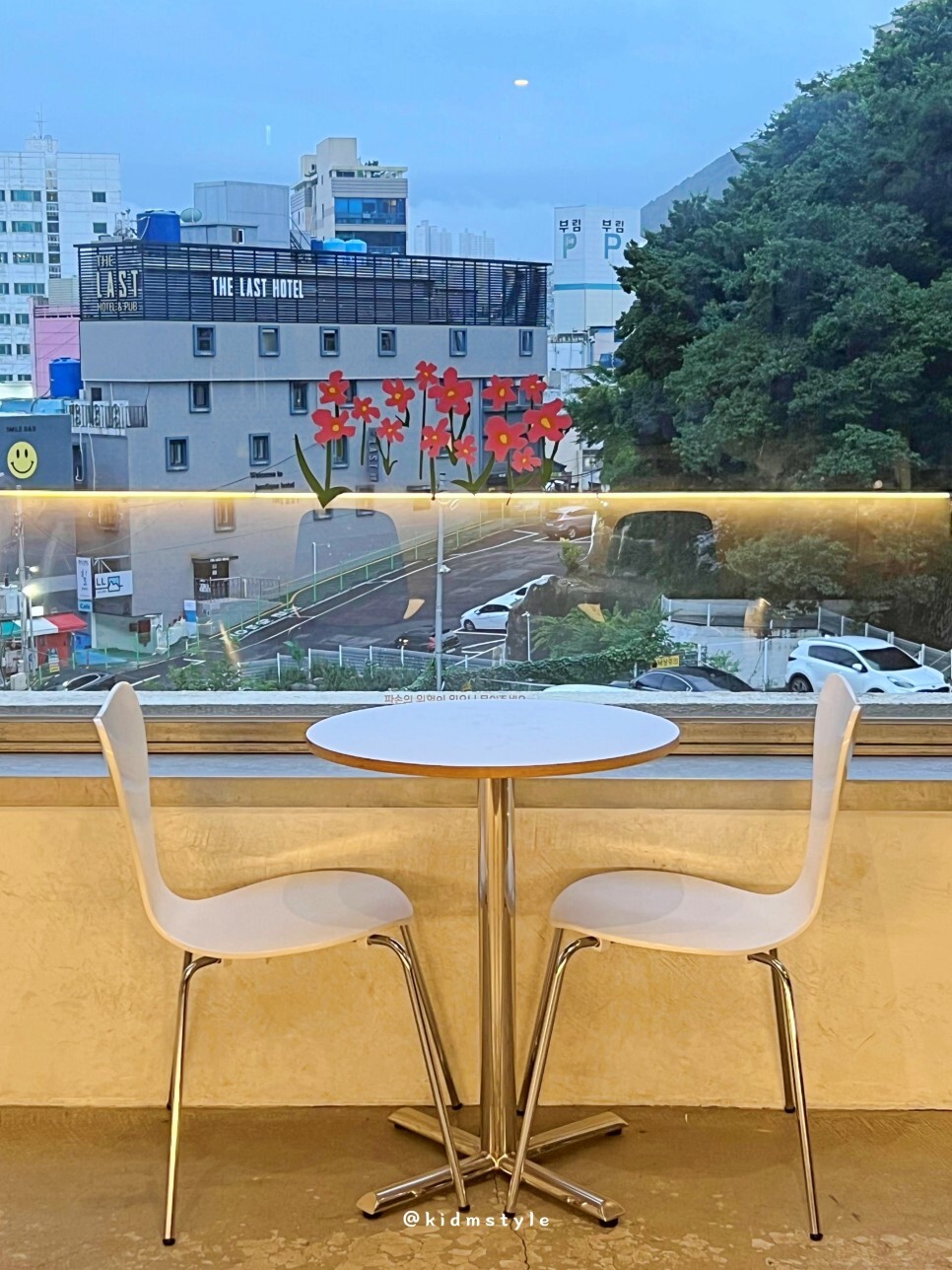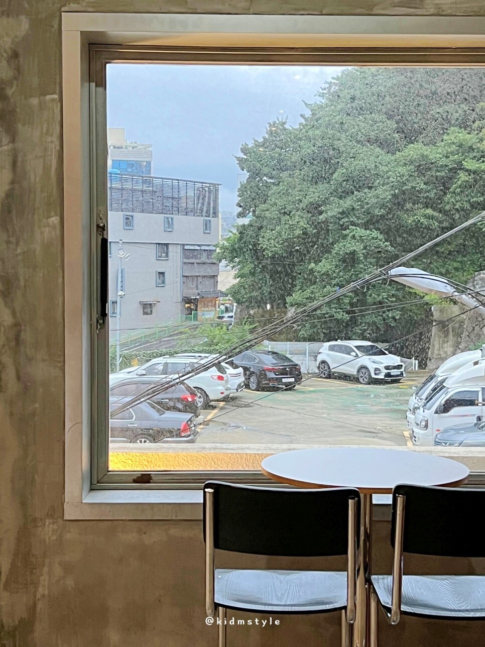 주문을 하고 2층, 3층을 둘러보았습니다. 창밖의 뷰는 주차장 뷰에요. 용두산공원의 커다란 나무도 함께 보입니다.