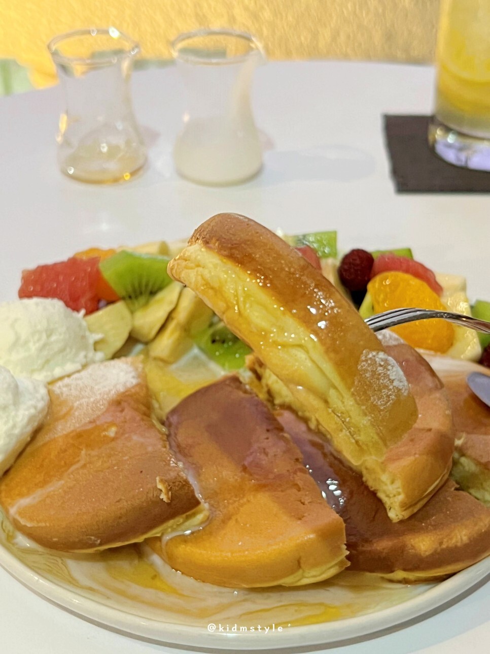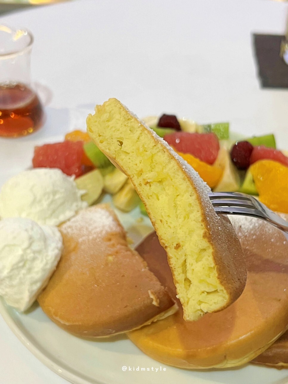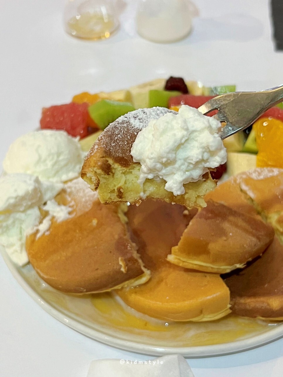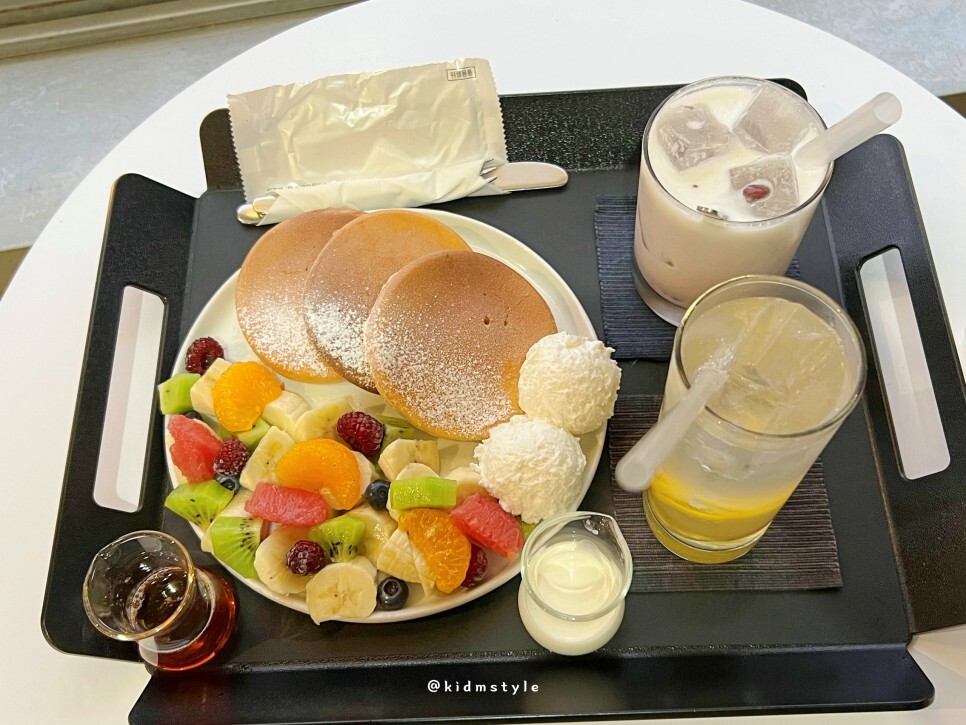 슈가파우더가 올라간 팬케이크는 정말 오래간만이라 반갑고요. 그 맛이 기대가 되네요. 사실 별거 없지만 그게 또 매력인 게 팬케이크잖아요. 키위, 바나나, 오렌지, 자몽, 산딸기 등의 과일은 상태가 신선했어요. 미리 잘라두지 않고 주문 즉시 손질하여 올린 것 같습니다.