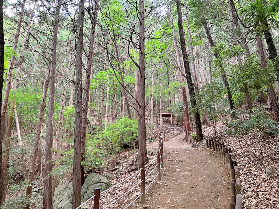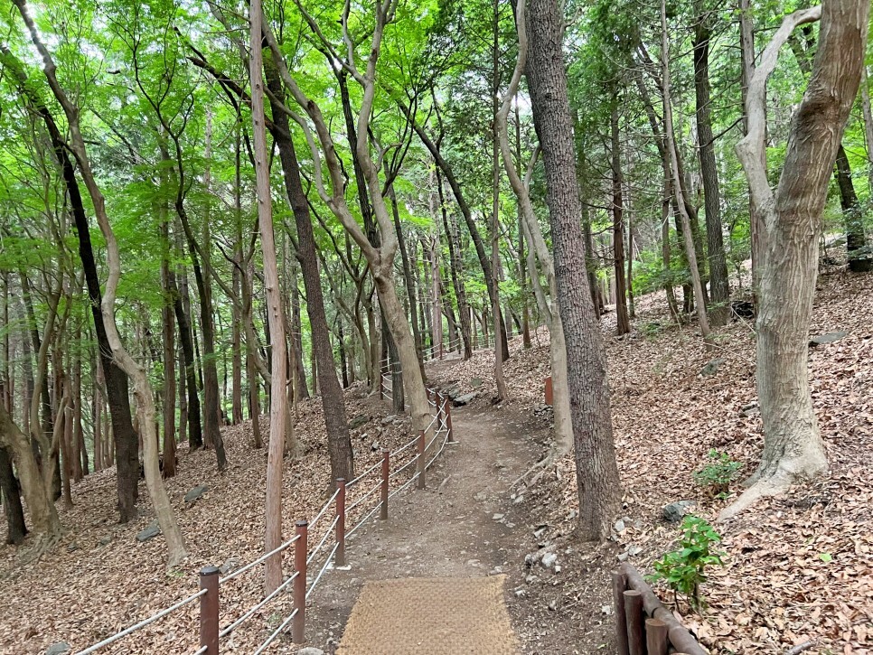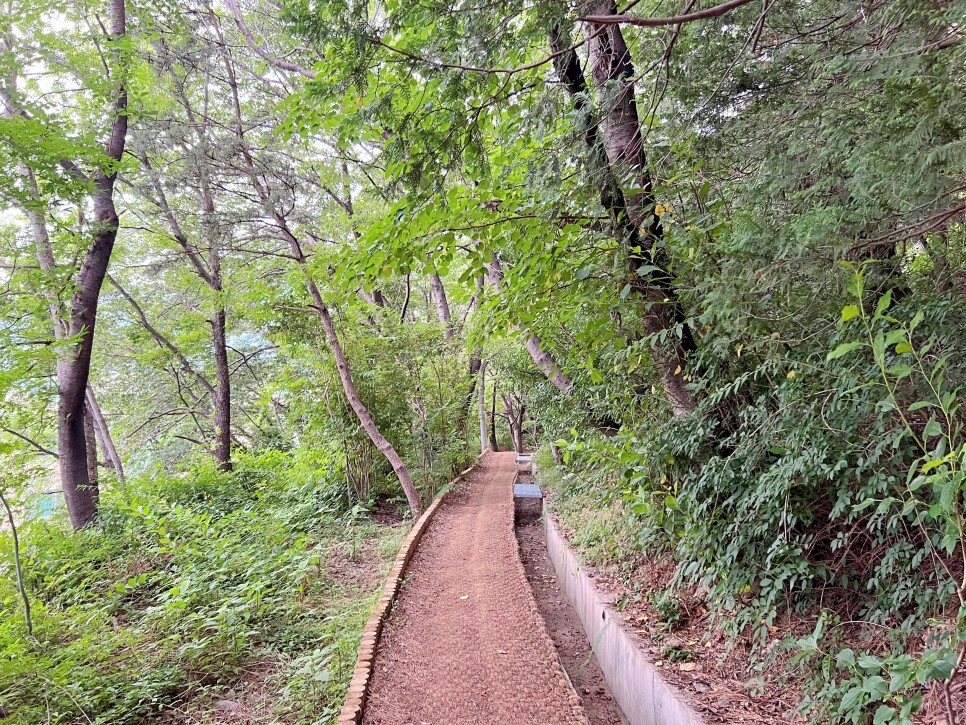 사진에는 경사가 표현이 잘 안되는데 제법 올라가고 있어요. 그래봐야 산책 수준이긴 합니다. 숲이 우거져 있어서 햇빛을 많이 받지 않아서 더 걷기 좋네요. 제가 찾은 날은 장마 기간에 매우 습한 날이라 땀이 비 오듯 흐르긴 했어요.