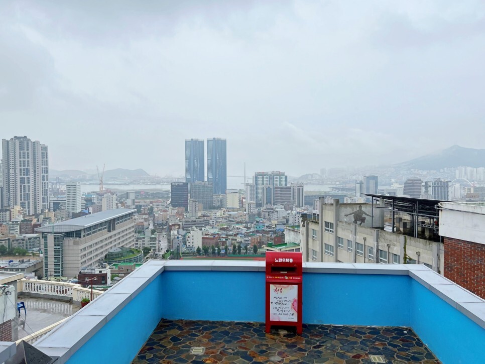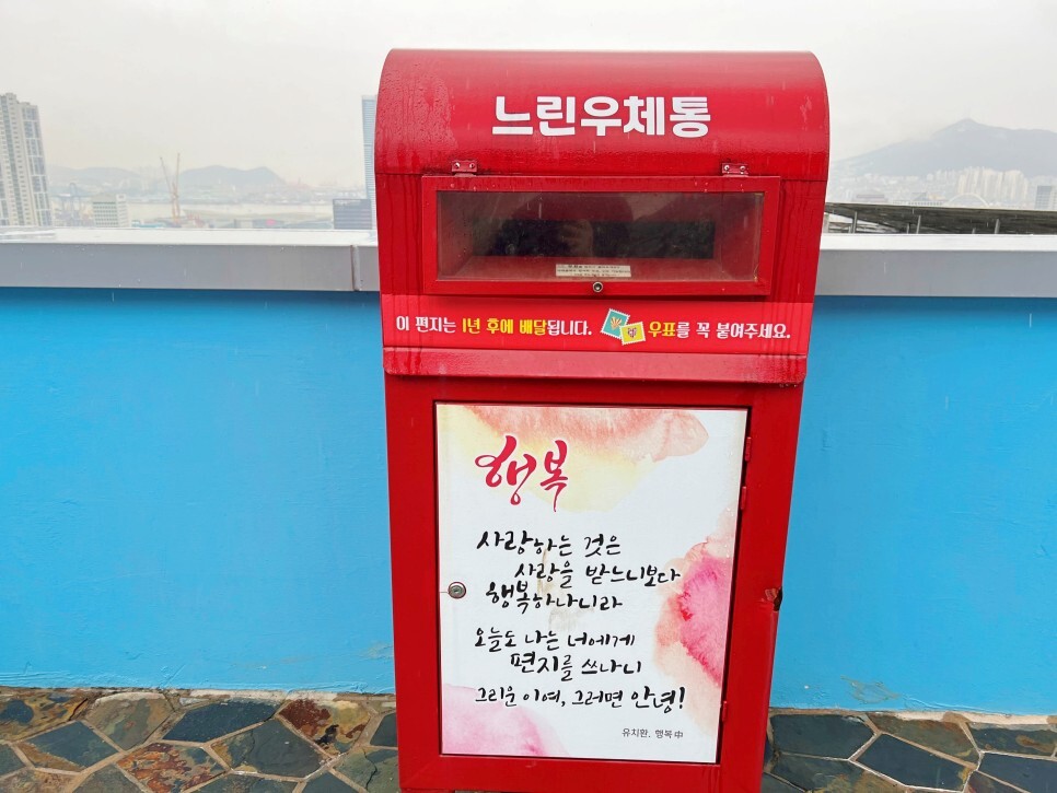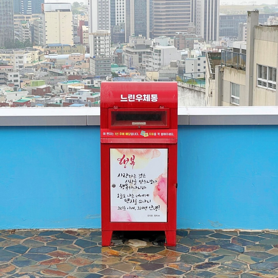 오래간만에 찾아왔습니다. 비가 올 때 한번 찾고 싶었던 곳입니다. 유치환의 우체통입니다. 초량 이바구길의 끄트머리에 위치한 곳인데요. 이곳은 산복도로를 한눈에 조망할 수 있는 전망대뿐만 아니라 1년 뒤 편지나 엽서가 전달되는 느린 우체통이 있답니다.