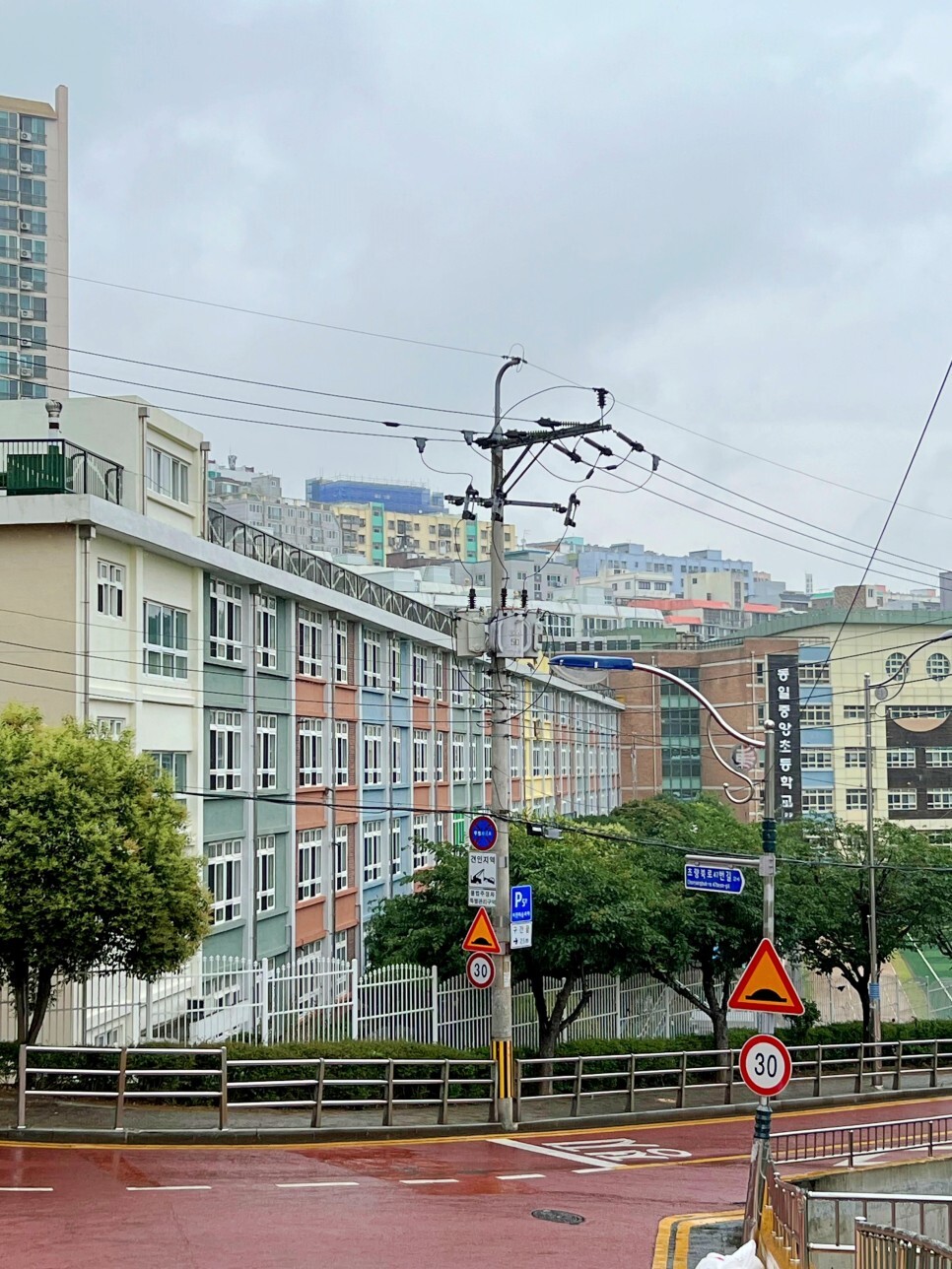 초등학교의 외벽 색깔이 예뻐서 찍어보았습니다. 비 오는 거리의 분위기가 사진에도 잘 전해지네요.