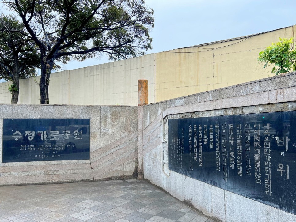 경남여자고등학교까지 걸어왔습니다. 제가 이곳을 찾은 이유가 있습니다. 교문 입구 오른쪽에 작은 안내판이 눈에 들어옵니다.