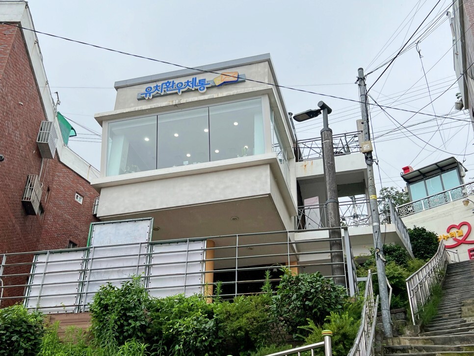 골목길을 내려가면서 바라본 유치환우체통 건물의 모습입니다. 부산 동구 초량, 수정동 일대에 터를 잡고 활동했던 시인 유치환을 기념하는 공간이라 더 의미가 있는 것 같아요.