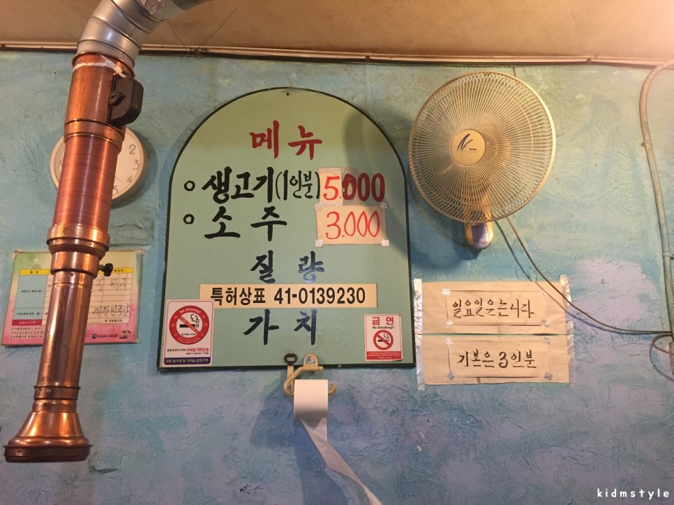 바닥에 작은 간판에는 생돼지 60년대식 할배 소금구이라고 적혀있다.