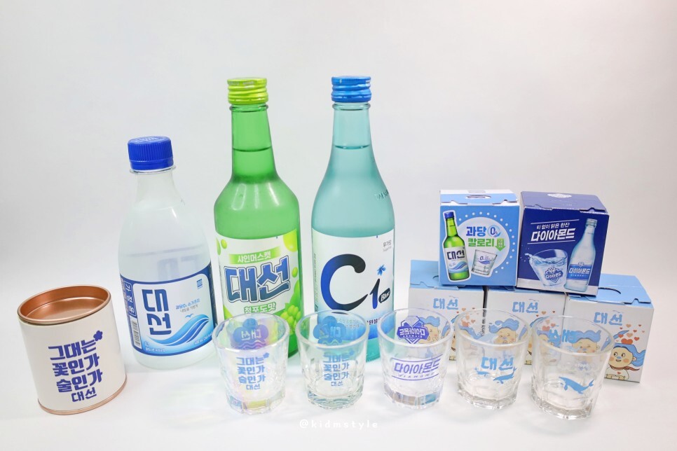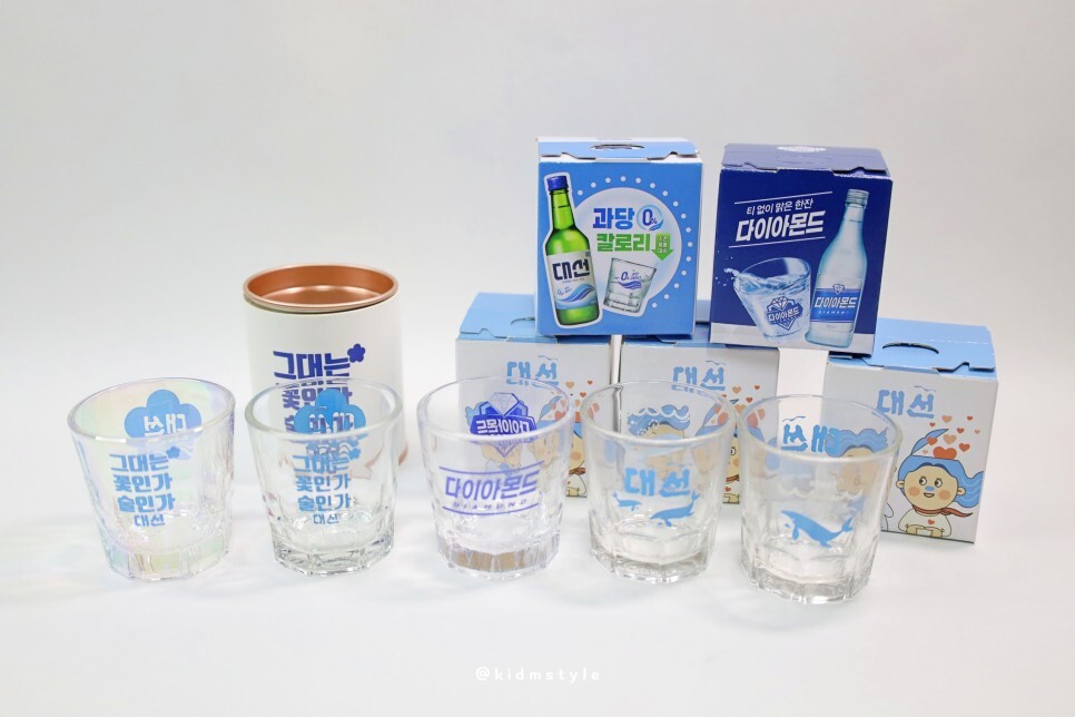 가지고 있는 대선 소주잔을 꺼내보았습니다. 부산 소주 대선 사랑 키드엠인데 이 정도 소주잔은 기본 아니겠습니까? 물론 타 브랜드 소주잔도 많아요. 한눈에 봐도 가장 왼쪽의 오로라 잔은 눈에 띄네요. 사진에는 빠졌는데 시원블루 잔도 있답니다.