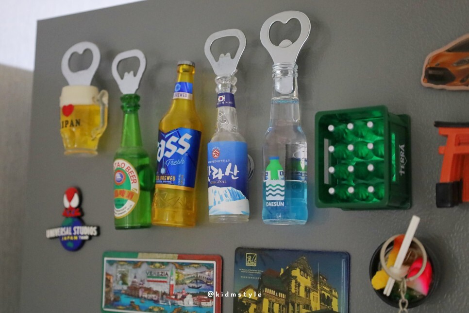 병따개는 냉장고 옆에 붙여두었어요. 물에 대선 소주병이 둥둥 떠있는 컨셉이라 너무 귀엽네요.