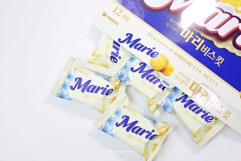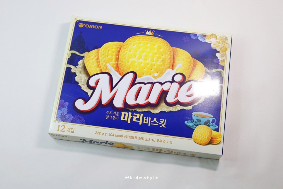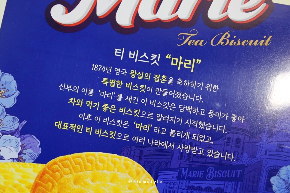 마리비스킷이 뭔지 몰랐는데 유래가 있네요. 1874년 영국 왕실의 결혼을 축하하기 위해 만들어진 비스킷으로 신부 이름 '마리'를 새긴 이 비스킷은 차와 먹기 좋은 비스킷으로 알려지기 시작했고요. 이후 마리라고 불리게 되었고 대표적인 티 비스킷으로 사랑받고 있다고 합니다.
