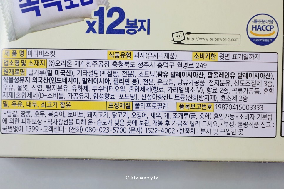 오리온 부드러운 밀크풍미 마리비스킷 영양성분 정보입니다. 뭐 사실 먹으면서 이런 거 안 따지고 먹게 되더군요. 맛있으면 0칼로리 법칙을 믿으며!