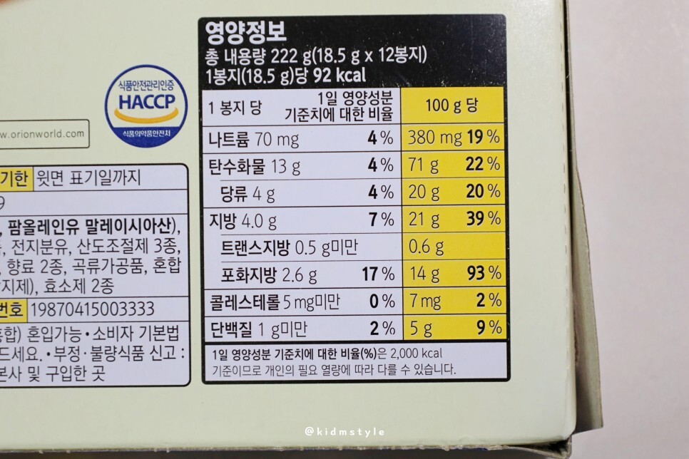 한 통은 총 222g에 1,104kcal입니다. 한 봉지에 92kcal네요. 생크림 (유크림) 2.3%, 우유 0.7% 등의 구성입니다.