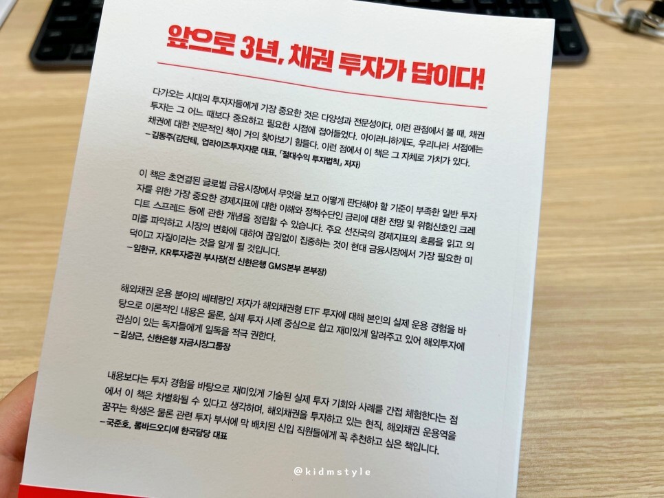 다양한 투자전문가들이 강력 추천하더군요. 책 내용에도 상세하게 나오는데 꽤 잘 만들어진 채권 투자 책임은 확실합니다.