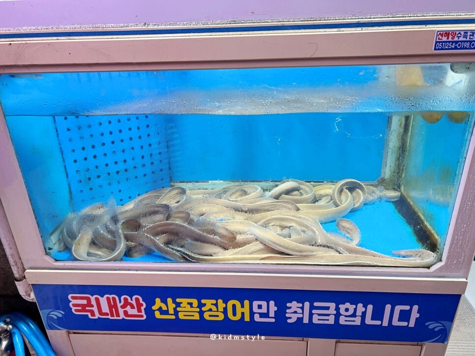 요즘 미국산 등 다른 나라 꼼장어를 많이 쓰는데 경북산꼼장어는 국내산 산꼼장어만 취급하기로도 유명해요. 수조에 살아있는 산꼼장어들을 보니 오늘도 상당히 기대가 됩니다.