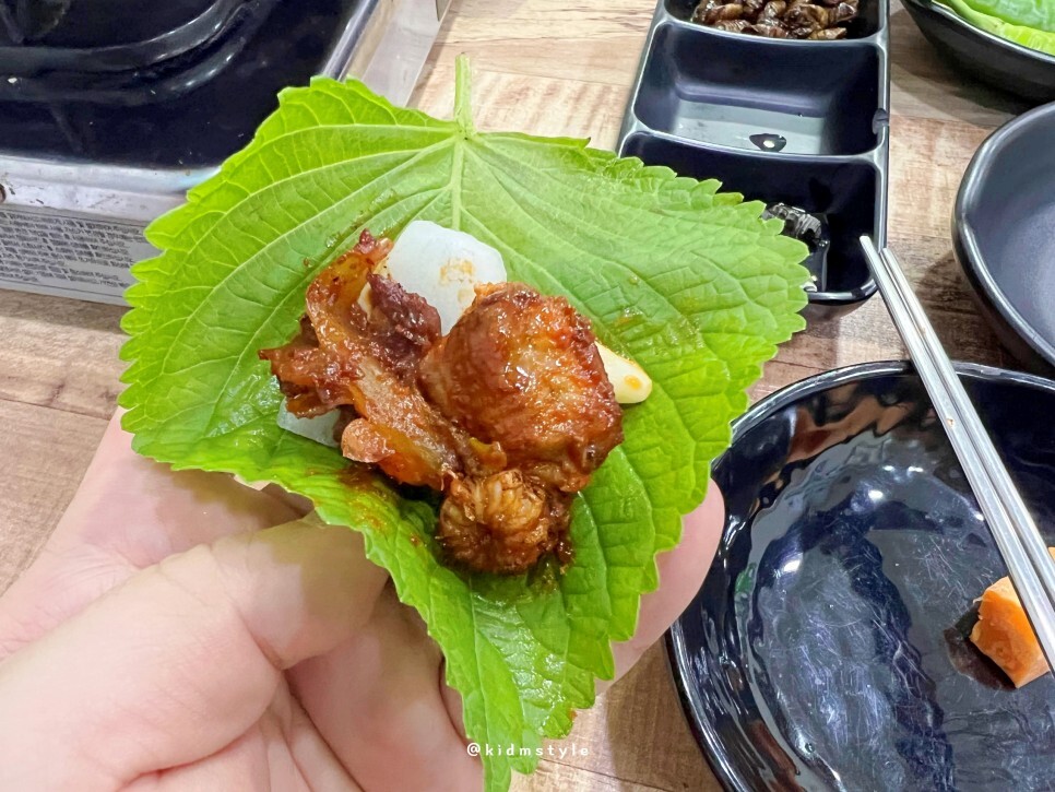 상추와 깻잎 쌈을 싸서 생마늘 하나 올리고 꼼장어와 채소를 골고루 올려서 한 쌈 싸 먹어봅니다. 고기 쌈도 좋지만 꼼장어 쌈도 상당히 맛있습니다. 특히나 통통하고 살이 많은 꼼장어는 쫄깃쫄깃한 식감도 좋고 그 맛이 상당히 좋습니다. 소주 한잔하기에 이만한 안주가 있겠나 싶습니다.