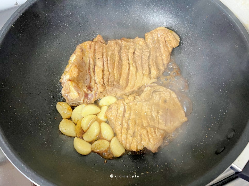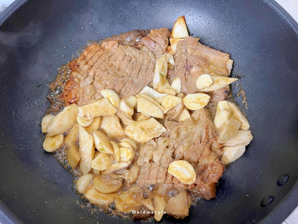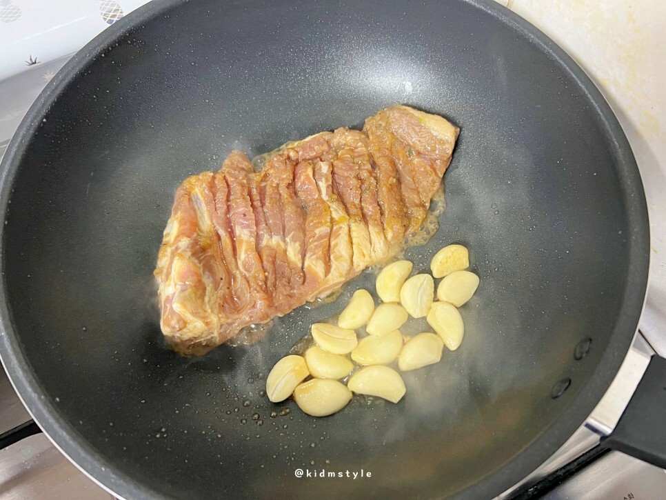 하루 숙성한 돼지갈비를 팬에 구워줍니다. 편 썬 마늘도 같이 구워줘요. 와 양념 냄새가 예사롭지 않은데요.