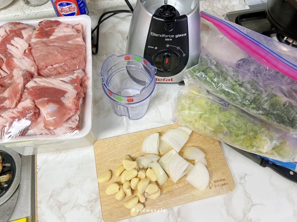 믹서기에 하나하나 넣고 갈아줍니다. 제가 사용하는 믹서기에 다지기 전용 툴이 있어서 손쉽게 갈아줄 수 있었네요.