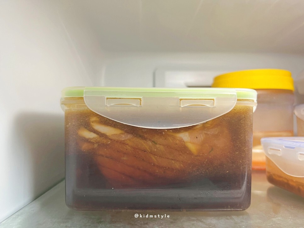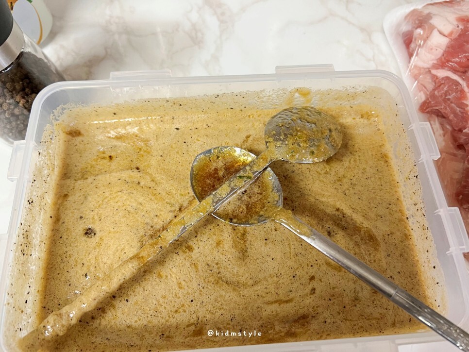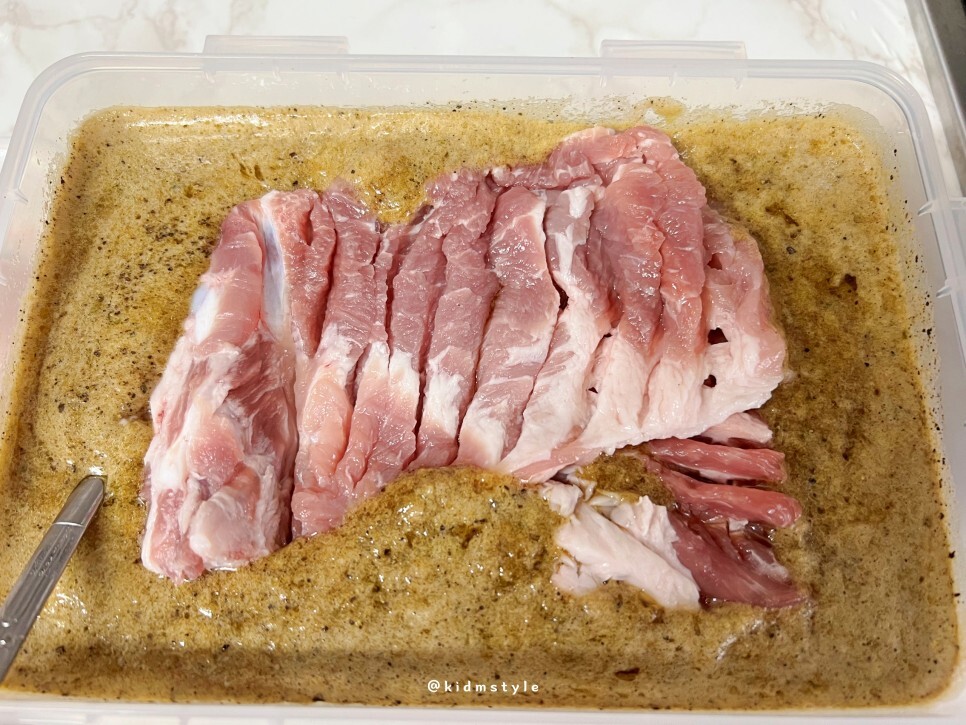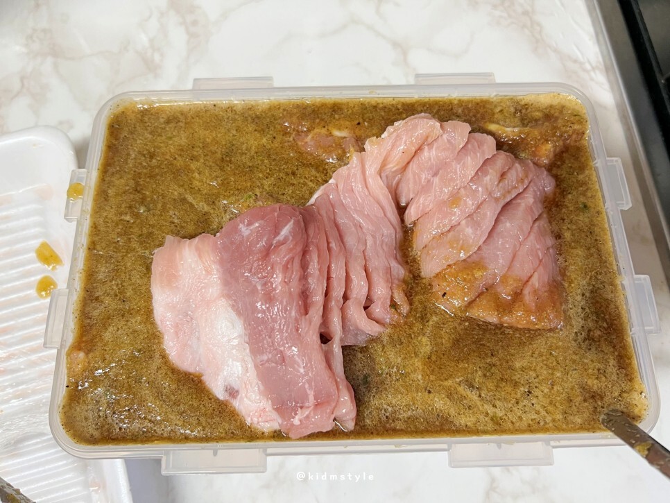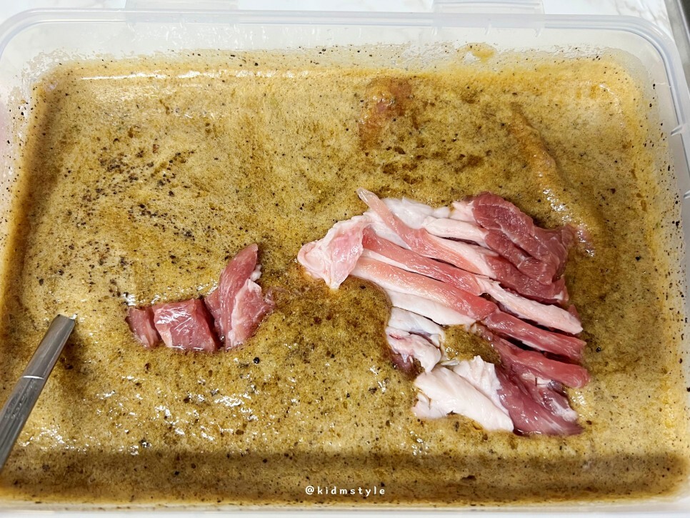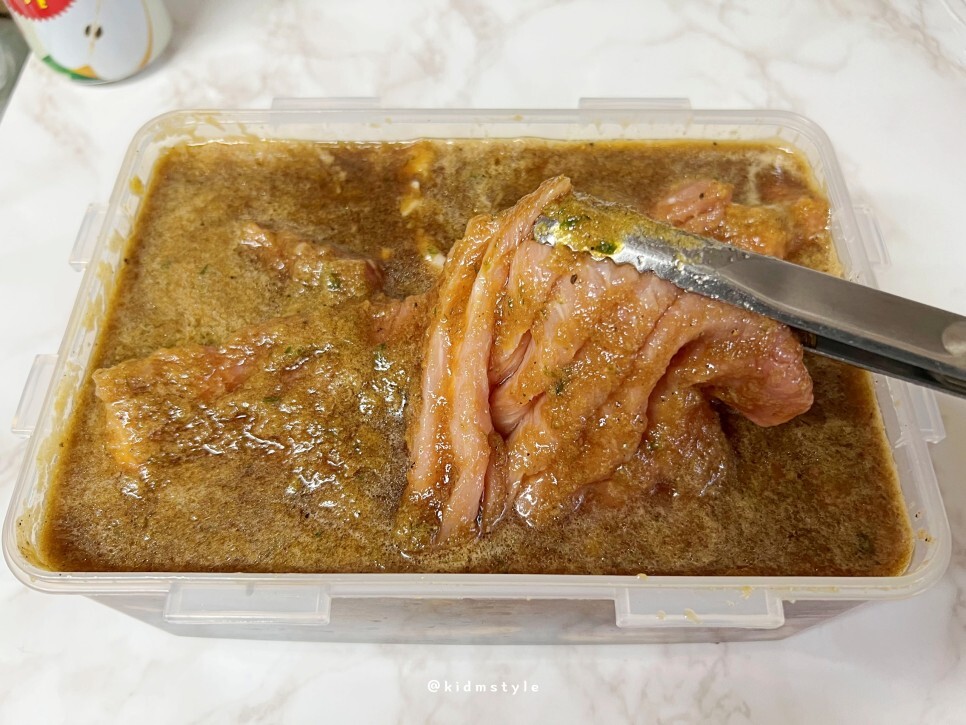 고기 양이 많아서 양념 통이 넘칠 것 같네요. 조금 더 큰 통에 재울 걸 그랬나요?