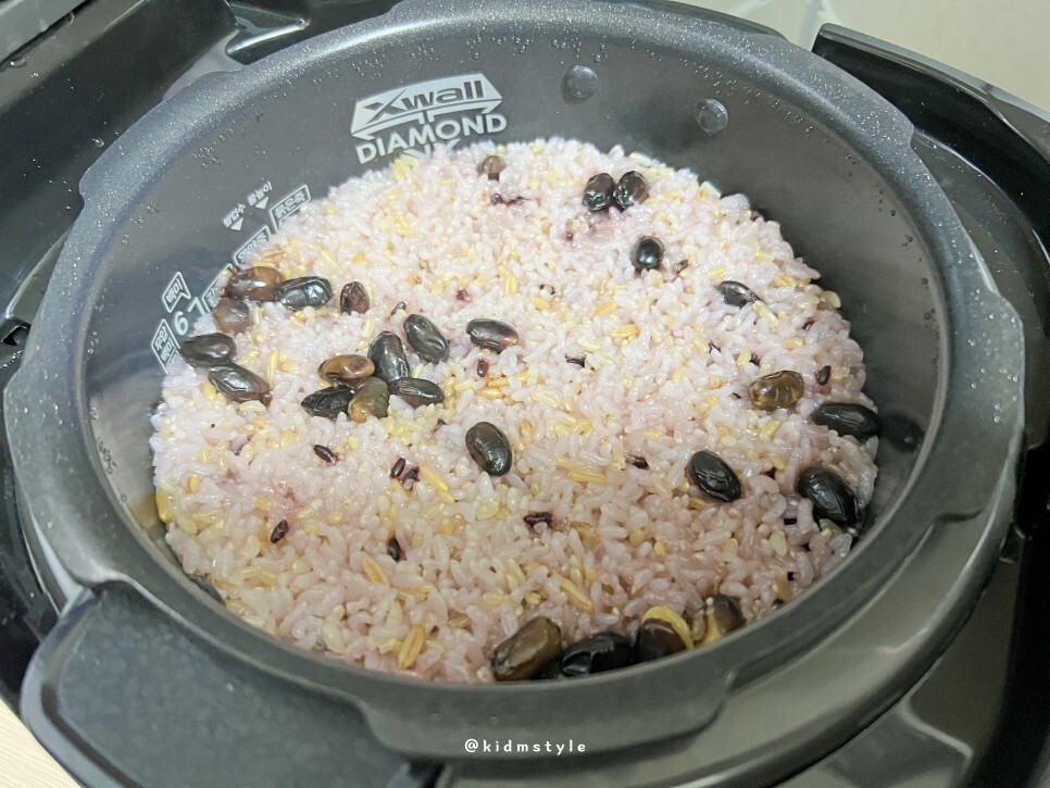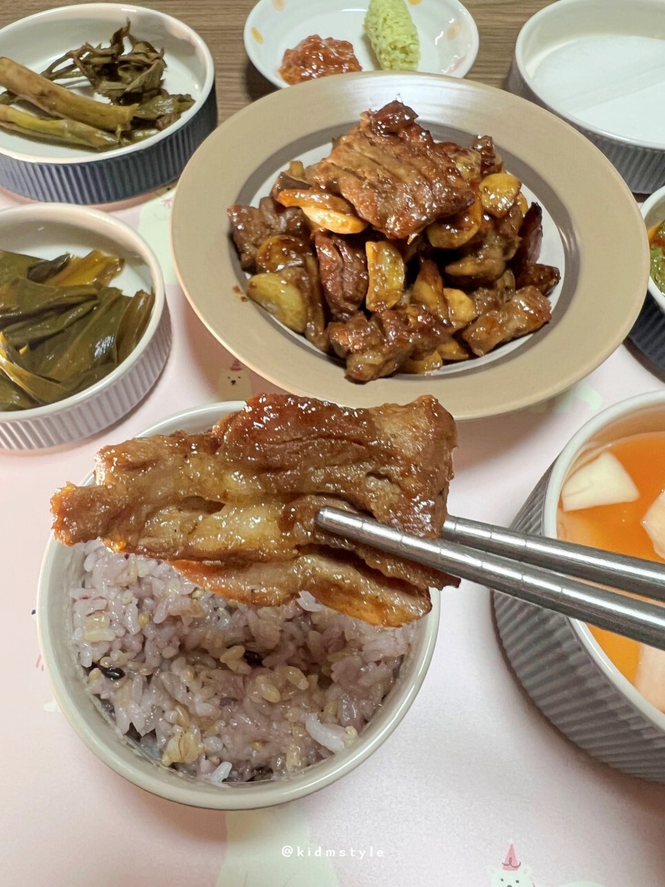 다음날 저녁이 되었습니다. 밥이 없어서 검은콩 잡곡밥도 해주고요. 돼지갈비에 참 잘 어울리는 밥이네요.