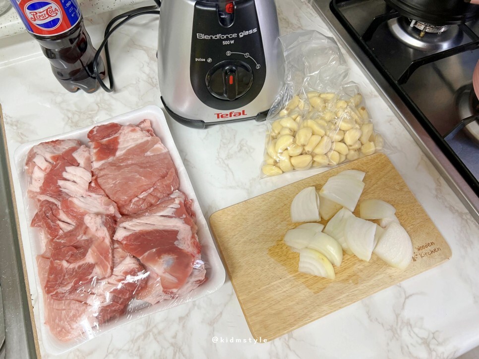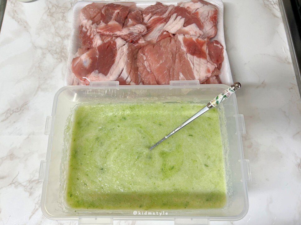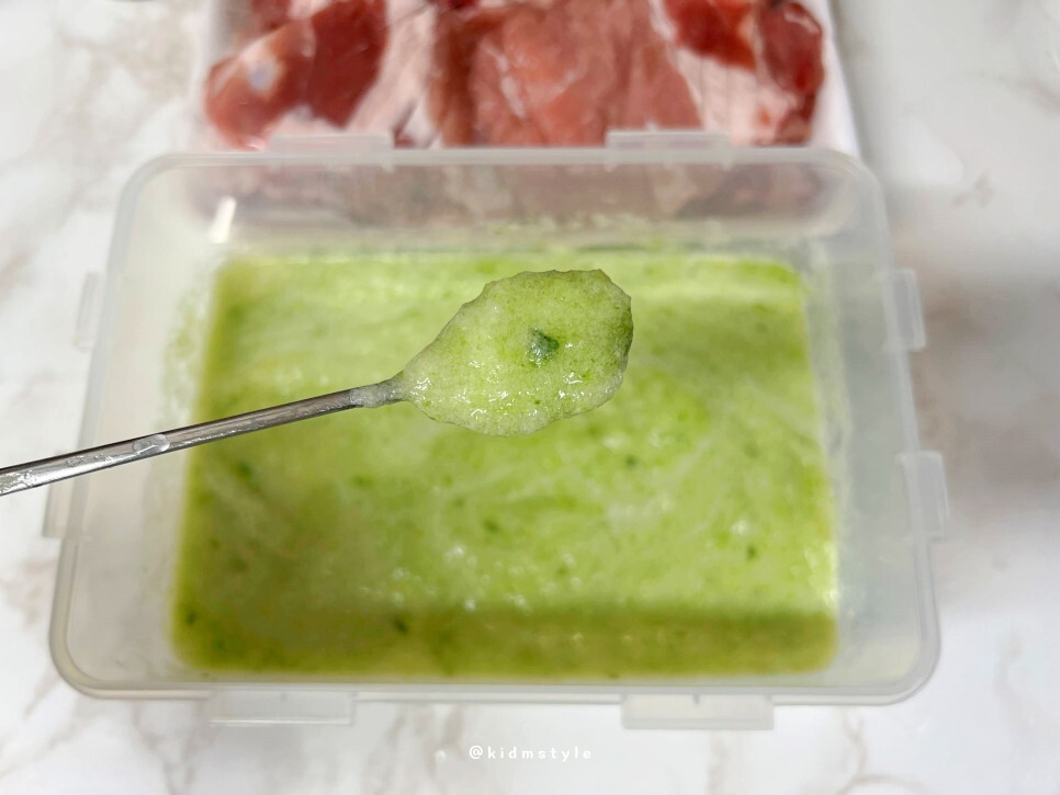 제가 준비한 돼지갈비 1.3kg 정도 기준으로 양파 반 개, 배 음료 200ml 정도, 다진 마늘 3 숟가락 정도, 대파 1줄 정도를 믹서기에 물 1컵을 넣고 갈았습니다. 갈비 양에 따라 유동적으로 변하기도 하고 세세한 레시피는 때에 따라 비중을 맞추면 되기 때문에 직접 해보면서 조절하는 게 좋은 것 같아요.