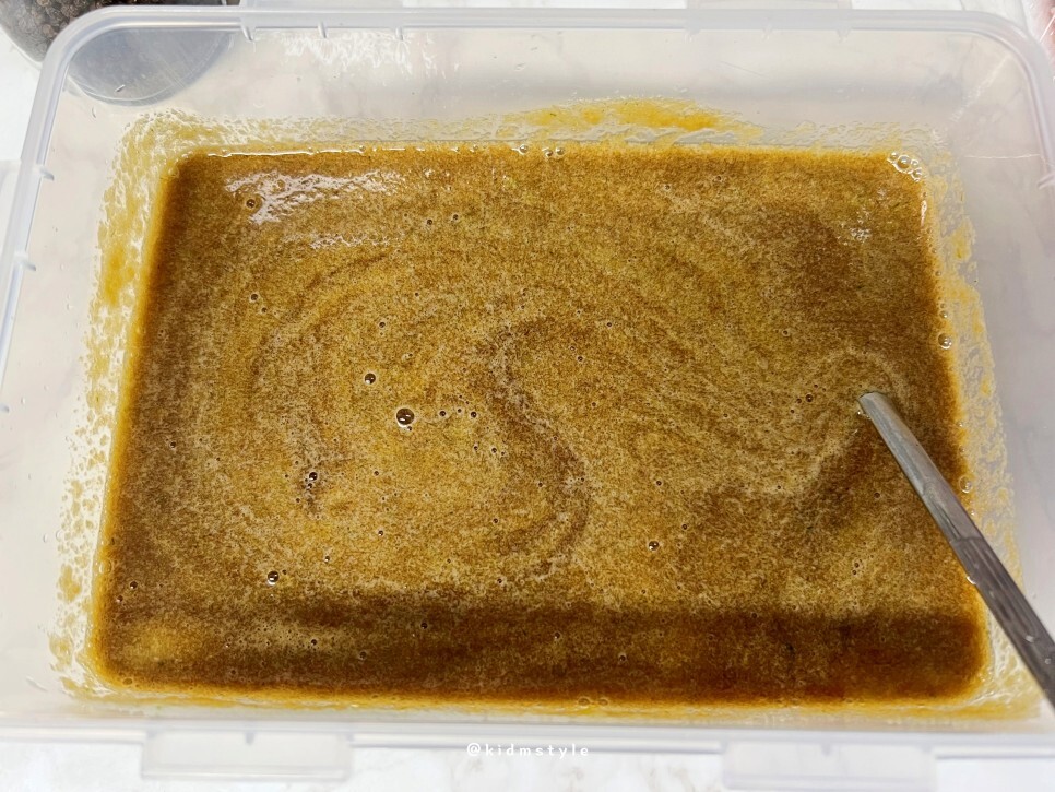 마지막 덩어리 넣었습니다. 양념이 넘쳐서 숟가락으로 몇 숟가락 버렸습니다. 다음에는 조금 더 큰 통을 사용하겠습니다.