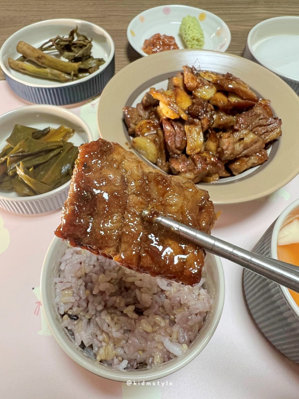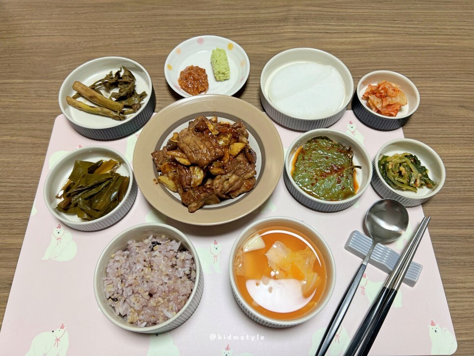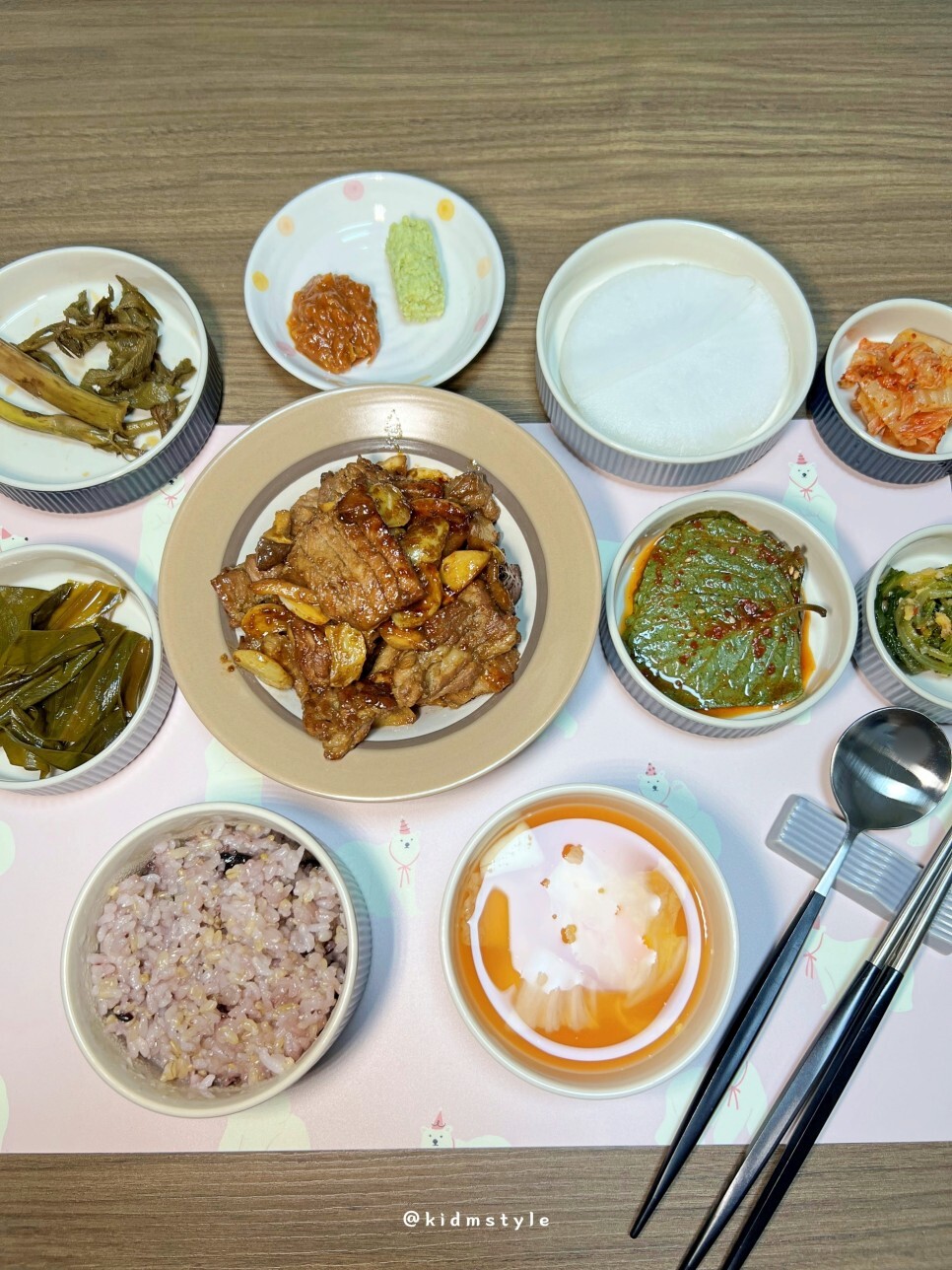오늘은 조금 다른 반찬으로 차려보았습니다. 어머니표 두릅 장아찌, 명이나물, 깻잎김치, 열무, 그리고 시원한 물김치가 돼지갈비와 잘 어울릴 것 같더군요. 생와사비도 빠질 수 없죠.