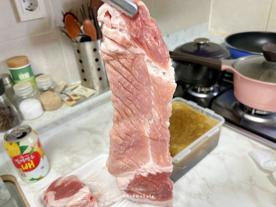 포 잘 떴죠? 생갈비로 구울까 고민 많이 했습니다. 하지만 양념돼지갈비를 위해서 열심히 재우기로 합니다.