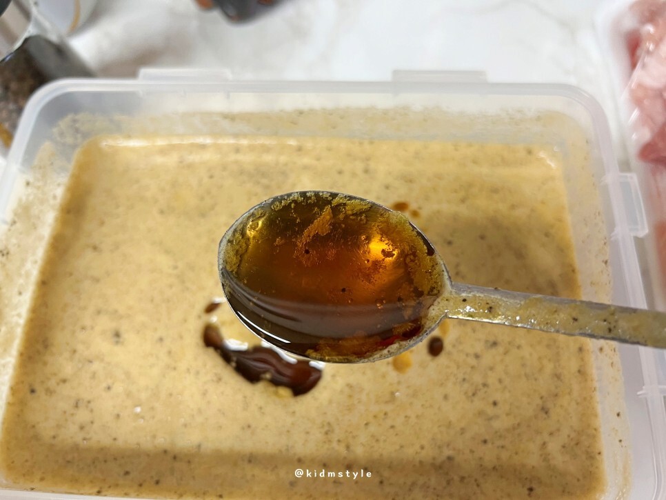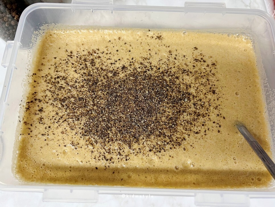 후추를 반 숟가락 정도 뿌려주면 되는데 통후추밖에 없어서 열심히 갈아올려줬습니다. 겨자도 반 숟가락 넣어주면 되는데 겨자가 없어서 과감히 생략합니다.