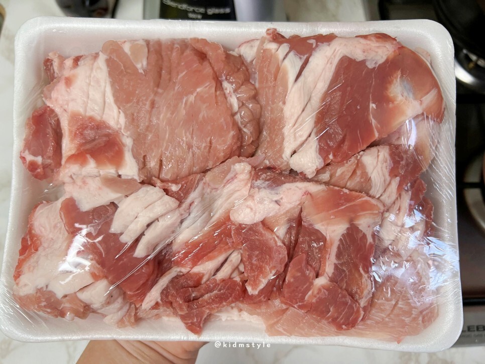 동네 시장에 단골 정육점이 있는데요. 돼지갈비를 덩어리로 팔더군요. 1.3kg 정도였고 100g에 1,280원 정도에 샀습니다. 돼지갈비용으로 포를 좀 떠달라고 했습니다. 물론 직접 집에서 결 따라 포를 떠도 됩니다.