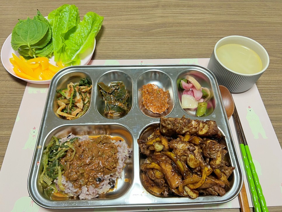 맛있는 한상을 차려봅니다. 앞 베란다 텃밭에서 수확한 깻잎과 상추를 준비하고요. 반찬으로는 배추 겉절이 김치, 대파 김치, 어머니표 수제 쌈장, 양파지, 잡곡밥에 강된장, 열무로 비빔밥을 먹을 거고요. 돼지갈비까지 구워왔습니다.