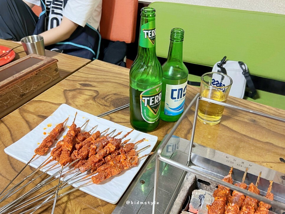 시원하게 목을 축이기 위해 부산 소주 대선과 테라 한 병 주문해서 소맥 한 잔 말아 마시는데 양꼬치 등장.