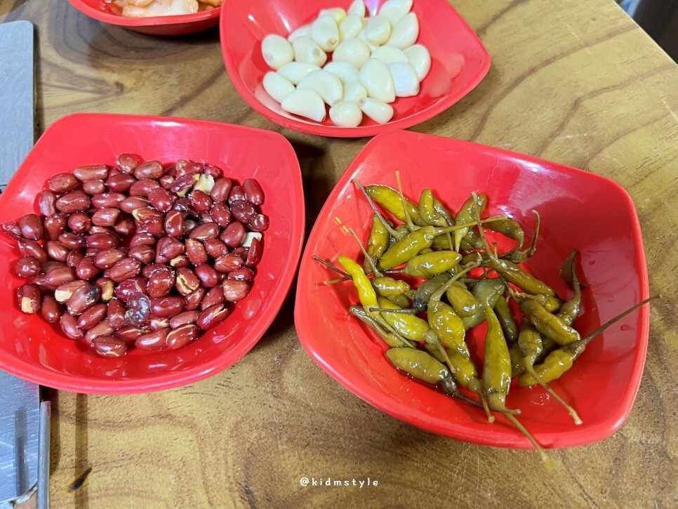 생마늘, 볶은 콩, 산고추 정도 기본 반찬으로 나온다. 산고추를 하나 집어먹어보니 맵싹하다.