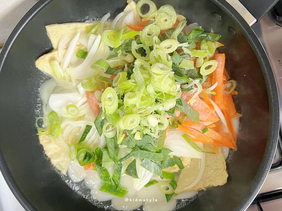 본 요리는 본격 냉털 요리이기 때문에 냉동실에 있는 것을 꺼내서 했다. 궁중팬에 대충 재료 넣고 냉동 소분해두었던 대파, 당근도 털어 넣고 물을 한 컵 정도 부어준다.