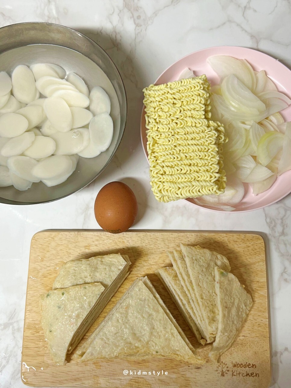 떡국 떡을 물에 좀 불려주고 라면 반 개, 양파, 달걀, 그리고 오뎅 몇 장 정도면 충분하다.