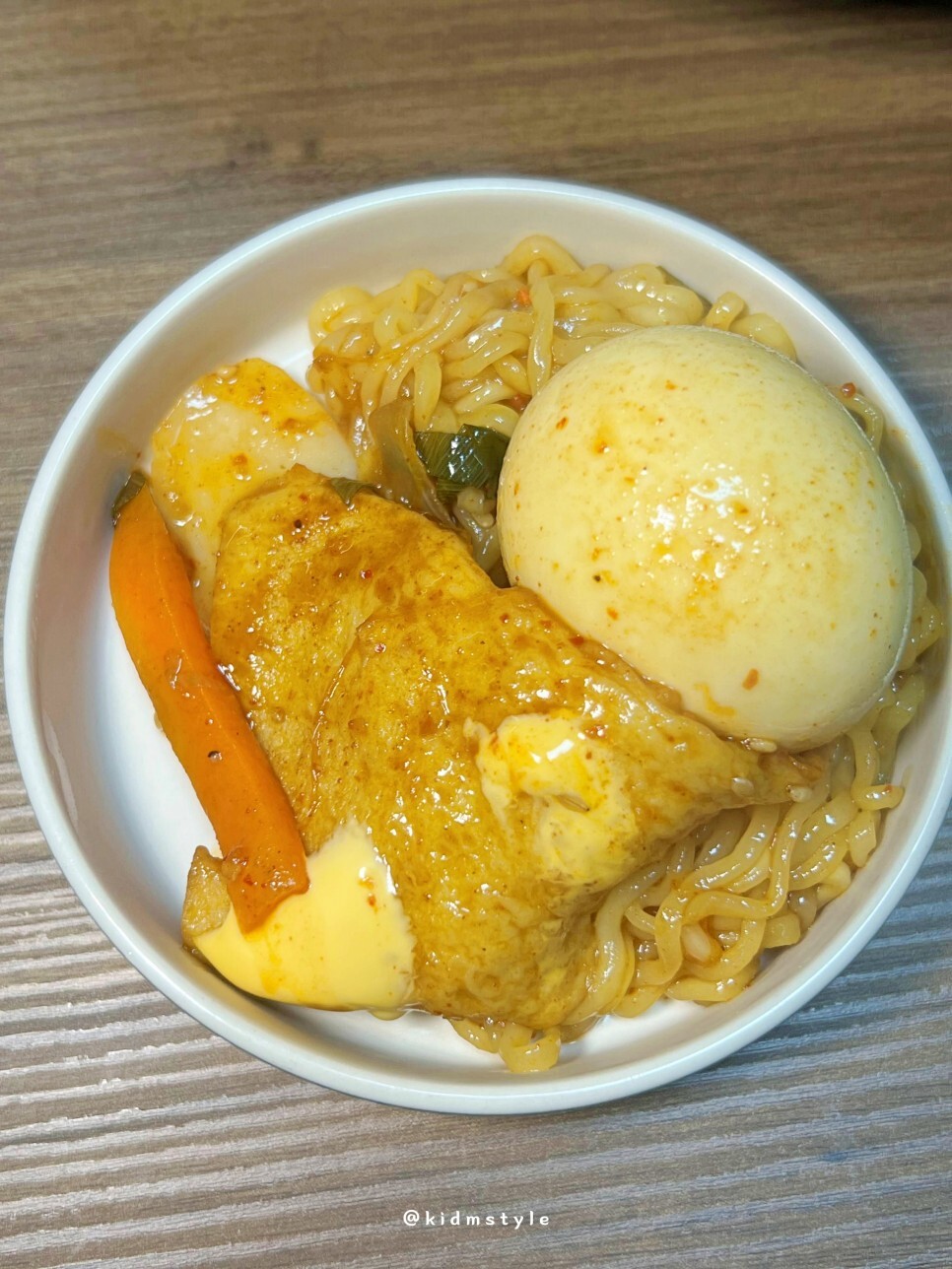 삶은 계란 조리가 끝난 냄비를 헹궈주고 거기에 라면을 익혀준다. 너무 익히면 퍼지니까 꼬들꼬들함이 남아있는 정도만. 그리고 팬에 면을 붓고 삶은 계란을 넣고 마지막 한소끔 끓여주면 된다.