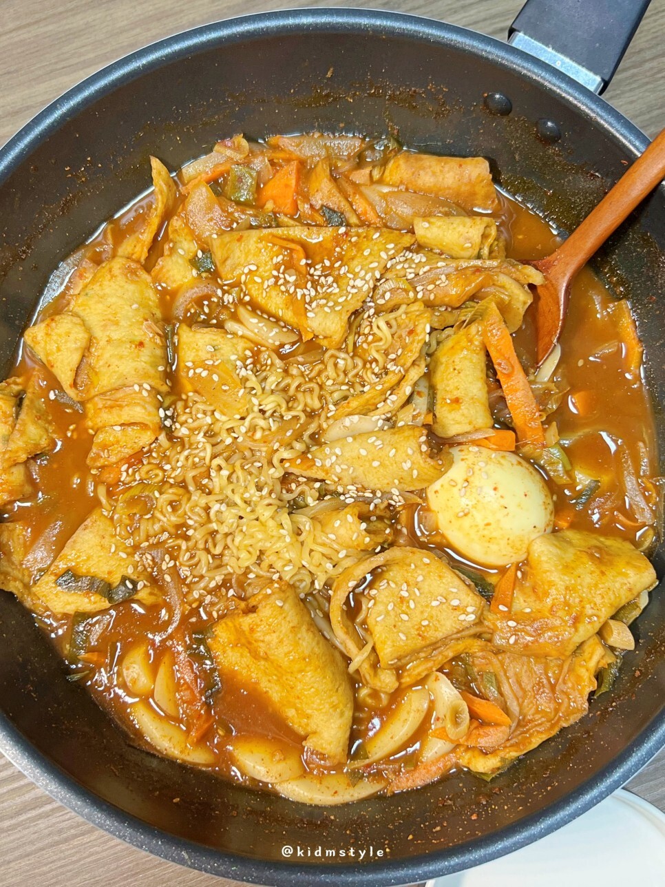 자작하게 국물을 좀 남겼다. 이 국물 떠먹는 것도 떡볶이 먹는 재미거든. 팬 째로 들고 와서 맛보기로 한다. 한자리에서 다 먹을 건 아니고 남은 건 한번 끓여서 냉장고에 넣고 다음날 먹으면 된다.