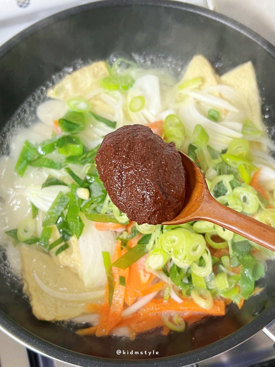 다시 팬으로 돌아와 좀 끓는다 싶으면 고추장을 크게 한 숟가락 넣어준다. 그리고 취향에 따라 더 넣어줘도 된다. 나는 더 넣었다.