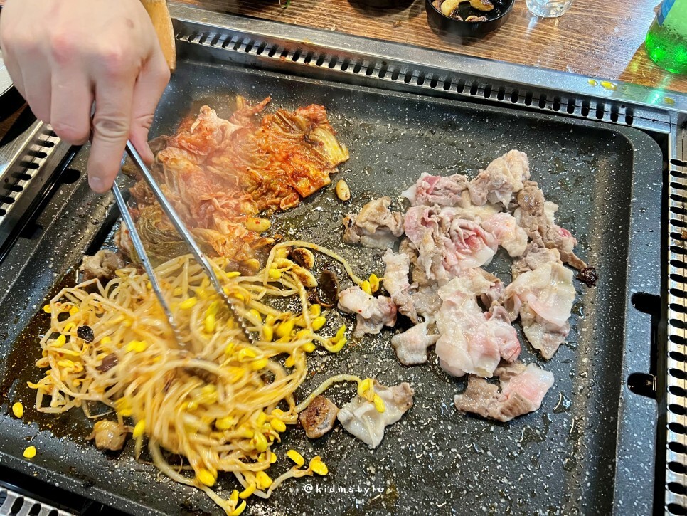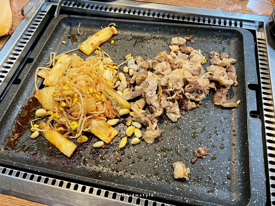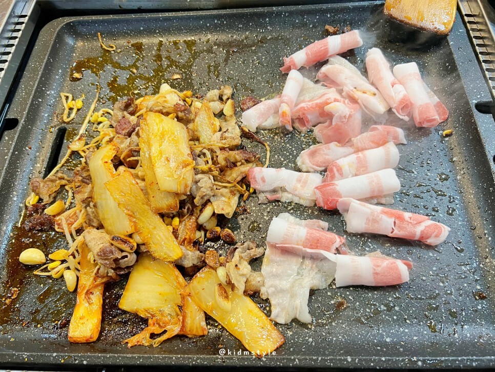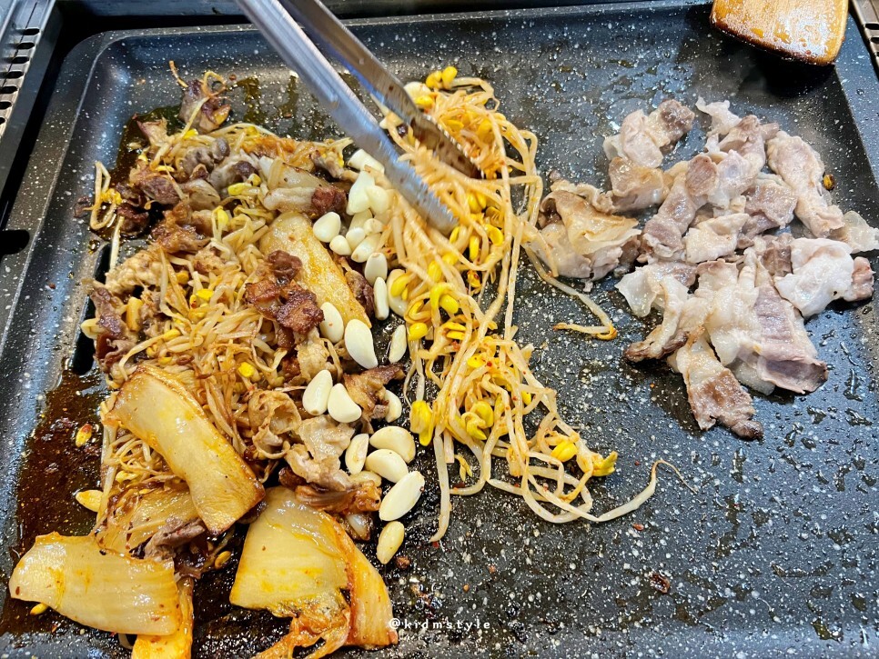 흐름이 끊기면 안 되니까 계속 구워준다. 대패 두께가 얇은 편이라 볶듯이 구워 먹기 좋다.