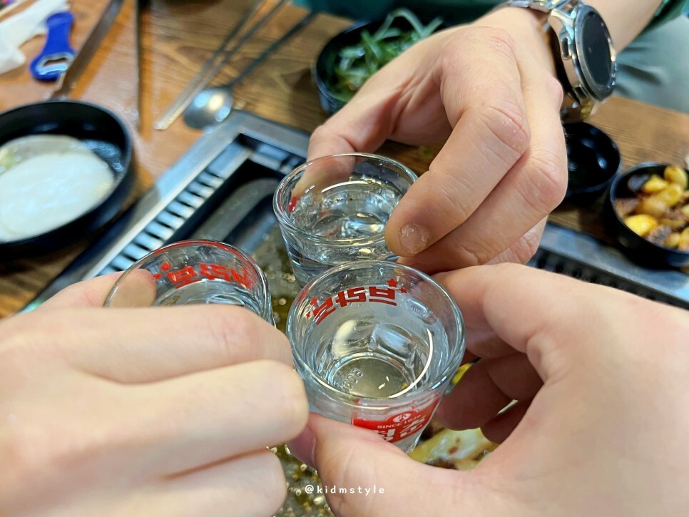 먼저 온 멤버가 열심히 굽고 있더라. 자리에 앉자마자 소맥에 고기 흡입해 주고