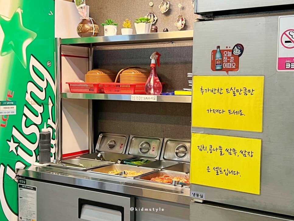 셀프 코너이다. 김치, 콩나물이 셀프라 너무 마음에 든다. 대패 먹으러 가면 그 두 개는 늘 엄청 구워 먹기 때문이다.